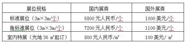 注:a.標(biāo)準(zhǔn)展位提供:三面圍板、楣板制作、洽談桌一張、折椅兩把、射燈兩盞、10A插座一個(gè)。 b.室內(nèi)特展及室外展區(qū)只提供光地,不提供任何配置,展商自行負(fù)責(zé)展位搭建布置的各種費(fèi)用。 2.技術(shù)交流會(huì):國(guó)內(nèi)企業(yè)20000元人民幣/30分鐘,境外企業(yè)3000美元/30分鐘(組委會(huì)有詳細(xì)資料備索)。 3.展會(huì)會(huì)刊: