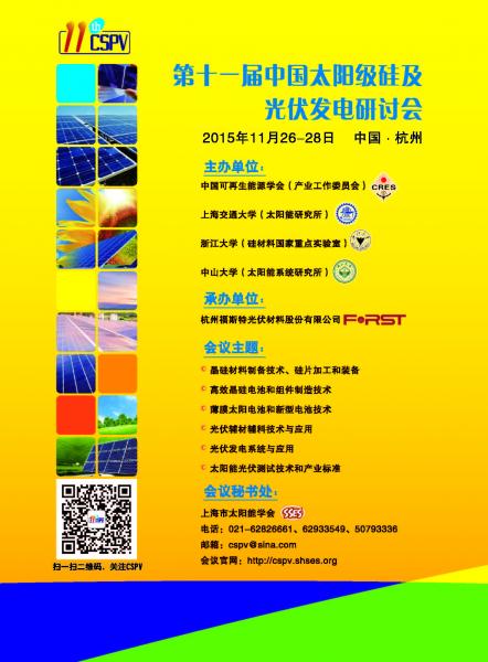 各位光伏同行: 中國太陽級硅及光伏發(fā)電研討會是我國硅材料及光伏發(fā)電領(lǐng)域最重要的學(xué)會會議之一。該會議每年舉行一次,已成功舉辦了十屆。為推動我國太陽級硅材料和光伏產(chǎn)業(yè)持續(xù)發(fā)展,《2015第十一屆中國太陽級硅及光伏發(fā)電研討會》將于2015年11月26-28日在浙江杭州舉行! h官網(wǎng):http://cspv.shses.org