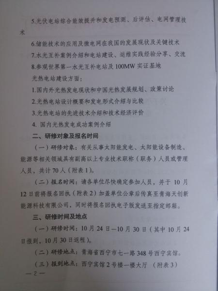 ![]() ![]() ![]() 聯(lián)系人:趙生武 咨詢(xún)電話:18697146750,0971-5362020 郵箱:279877130@qq.com 一、培訓(xùn)介紹 1、此次“高級(jí)研修班”為國(guó)家人社部牽頭,青海人事廳執(zhí)行的全國(guó)性質(zhì)的國(guó)家級(jí)重大技術(shù)高級(jí)研修班,完全不同于部門(mén)或行業(yè)的各類(lèi)普通付費(fèi)業(yè)務(wù)培訓(xùn)。 2、授課專(zhuān)家均為在國(guó)內(nèi)乃至國(guó)際太陽(yáng)能發(fā)電行業(yè)的頂級(jí)權(quán)威專(zhuān)家。涵蓋光伏發(fā)電和光熱發(fā)電兩個(gè)方面,包括政策、系統(tǒng)設(shè)計(jì)、應(yīng)用、檢測(cè)、標(biāo)準(zhǔn)制定等多個(gè)內(nèi)容。 3、具有實(shí)戰(zhàn)性和接地氣的培訓(xùn)課程設(shè)置一定會(huì)符合高級(jí)技術(shù)人員胃口,授課內(nèi)容絕不是行業(yè)皮毛和基礎(chǔ)理論。 4、此次研修班為高級(jí)別、純技術(shù)培訓(xùn)班,一流的授課專(zhuān)家,參會(huì)人員為企業(yè)負(fù)責(zé)人或企業(yè)單位首席技術(shù)專(zhuān)家,全部是行業(yè)精英和翹楚。 5、為廣大培訓(xùn)學(xué)員搭建了一個(gè)相互交流、相互認(rèn)識(shí)的精英展示互動(dòng)平臺(tái)。 6、培訓(xùn)期間,所有參會(huì)人員都將獲得參觀“世界最大850MW水光互補(bǔ)電站”及“世界最大100MW光伏實(shí)證基地”的難得機(jī)會(huì)。 7、人員參會(huì)免費(fèi),不同于其他培訓(xùn)機(jī)構(gòu)以賺取會(huì)務(wù)費(fèi)用為目的。 二、專(zhuān)家陣容: 王斯成 研究員 中國(guó)可再生能源學(xué)會(huì)常務(wù)理事,光伏專(zhuān)委會(huì)副主任(中國(guó)光伏應(yīng)用系統(tǒng)首席專(zhuān)家)。 Hansjoerg Gabler 教授、博士 前德國(guó)弗勞恩霍夫太陽(yáng)能系統(tǒng)研究所(Fraunhofer Institute for Solar Energy Systems ISE)光伏系統(tǒng)和測(cè)量部負(fù)責(zé)人,德國(guó)百登烏特堡太陽(yáng)能和氫氣研究中心(ZSW)部門(mén)主任(國(guó)際公認(rèn)的光伏電站系統(tǒng)設(shè)計(jì)、檢測(cè)頂級(jí)專(zhuān)家)。 吳達(dá)成 研究員 中國(guó)可再生能源學(xué)常務(wù)理事、光伏專(zhuān)委會(huì)副主任(中國(guó)光伏政策主要制定者之一)。 王躍社教授、博士生導(dǎo)師 西安交通大學(xué)動(dòng)力工程多相流國(guó)家重點(diǎn)實(shí)驗(yàn)室教授、聯(lián)合博士生導(dǎo)師,研究方向?yàn)樾履茉醇疤?yáng)能高效熱利用發(fā)電技術(shù)。 汪毅 中國(guó)電力企業(yè)聯(lián)合會(huì)標(biāo)準(zhǔn)化管理中心發(fā)電標(biāo)準(zhǔn)處處長(zhǎng)。