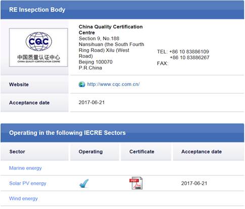 繼“領(lǐng)跑者”認(rèn)證結(jié)果被國(guó)家能源局“領(lǐng)跑者”項(xiàng)目、地方政府、扶貧項(xiàng)目和金融機(jī)構(gòu)等多方采信、獲得中國(guó)國(guó)家標(biāo)準(zhǔn)化管理委員會(huì)授權(quán)開(kāi)展光伏產(chǎn)品企業(yè)標(biāo)準(zhǔn)“領(lǐng)跑者”評(píng)價(jià)后,近日,中國(guó)質(zhì)量認(rèn)證中心(簡(jiǎn)稱(chēng)CQC)再獲國(guó)際組織認(rèn)可,順利取得國(guó)際電工委員會(huì)可再生能源設(shè)備認(rèn)證互認(rèn)體系(IECRE)的認(rèn)證機(jī)構(gòu)和檢驗(yàn)機(jī)構(gòu)資質(zhì)。至此,CQC不僅是國(guó)內(nèi)首家取得中國(guó)合格評(píng)定國(guó)家認(rèn)可委員會(huì)(簡(jiǎn)稱(chēng)CNAS)ISO/IEC 17020光伏和風(fēng)能檢驗(yàn)機(jī)構(gòu)雙認(rèn)可的機(jī)構(gòu),CQC及其分支機(jī)構(gòu)同時(shí)也是國(guó)際上獲得IECRE體系光伏、風(fēng)能兩大領(lǐng)域檢驗(yàn)、檢測(cè)和認(rèn)證所有資質(zhì)的第一批機(jī)構(gòu),已經(jīng)滿(mǎn)足開(kāi)展IECRE關(guān)于光伏系統(tǒng)認(rèn)證和風(fēng)電系統(tǒng)認(rèn)證的全部技術(shù)要求,CQC出具的認(rèn)證證書(shū)將會(huì)在IECRE多邊互認(rèn)體系中被承認(rèn),助力我國(guó)光伏和風(fēng)電企業(yè)“走出去”,在全球新能源市場(chǎng)繼續(xù)領(lǐng)跑。 ![]() 圖1IECRE官方網(wǎng)站中CQC認(rèn)證機(jī)構(gòu)(Certification Body)資質(zhì)信息