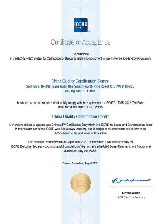 繼“領(lǐng)跑者”認(rèn)證結(jié)果被國(guó)家能源局“領(lǐng)跑者”項(xiàng)目、地方政府、扶貧項(xiàng)目和金融機(jī)構(gòu)等多方采信、獲得中國(guó)國(guó)家標(biāo)準(zhǔn)化管理委員會(huì)授權(quán)開(kāi)展光伏產(chǎn)品企業(yè)標(biāo)準(zhǔn)“領(lǐng)跑者”評(píng)價(jià)后,近日,中國(guó)質(zhì)量認(rèn)證中心(簡(jiǎn)稱(chēng)CQC)再獲國(guó)際組織認(rèn)可,順利取得國(guó)際電工委員會(huì)可再生能源設(shè)備認(rèn)證互認(rèn)體系(IECRE)的認(rèn)證機(jī)構(gòu)和檢驗(yàn)機(jī)構(gòu)資質(zhì)! ≈链耍珻Q