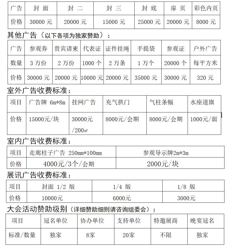 時(shí)間:2018年9月27日-29日 地點(diǎn):鄭州國(guó)際會(huì)展中心 指導(dǎo)單位:河南省住房與城鄉(xiāng)建設(shè)廳 主辦單位:河南省市政公用業(yè)協(xié)會(huì) 特邀支持:河南省工程勘察設(shè)計(jì)行業(yè)協(xié)會(huì) 河南省建筑業(yè)協(xié)會(huì) 河南省園林綠化協(xié)會(huì) 河南省土木建筑學(xué)會(huì) 河南省建設(shè)科技協(xié)會(huì) 河南省城市規(guī)劃協(xié)會(huì) 河南省建設(shè)監(jiān)理協(xié)會(huì) 河南省村鎮(zhèn)規(guī)劃建設(shè)協(xié)會(huì) 協(xié)辦單位:河南省十八省轄市、直管縣(市) 城建行政主管部門 河南省各縣(區(qū))城建行政主管部門 省內(nèi)外城市建設(shè)知名企事業(yè)單位 承辦單位:河南翔宇展覽服務(wù)有限公司 大會(huì)宗旨: 貫徹中央、全省城市工作會(huì)議精神,落實(shí)省委省政府《關(guān)于加強(qiáng)城市規(guī)劃建設(shè)管理工作的意見》及《關(guān)于推進(jìn)百城建設(shè)提質(zhì)工程的意見》,加快我省新型城鎮(zhèn)化發(fā)展,讓中原更加出彩。 目的和意義: “百城提質(zhì).聚焦河南”,我省百城建設(shè)提質(zhì)工程項(xiàng)目啟動(dòng)以來(lái),得到社會(huì)各界廣泛關(guān)注并積極參與。百城提質(zhì)項(xiàng)目需求巨大,省委、省政府拿出巨額資金,并通過(guò)社會(huì)資本合作(PPP)模式,對(duì)全省106個(gè)縣城、縣級(jí)市進(jìn)行城市基礎(chǔ)設(shè)施配套建設(shè)。僅第一批實(shí)施的45個(gè)市縣共入庫(kù)項(xiàng)目9351個(gè),總投資2.7萬(wàn)億元。并將陸續(xù)加大投入,力爭(zhēng)三到五年,一批縣級(jí)城市達(dá)到全國(guó)一流水平。 為配合我省百城建設(shè)提質(zhì)工程項(xiàng)目推進(jìn),為市政基礎(chǔ)設(shè)施、公共服務(wù)設(shè)施、生態(tài)設(shè)施建設(shè)等項(xiàng)目引進(jìn)新技術(shù)、新工藝,提供新裝備、新產(chǎn)品,展示項(xiàng)目工程系統(tǒng)解決方案。在河南省住房與城鄉(xiāng)建設(shè)廳的指導(dǎo)下,河南省市政公用業(yè)協(xié)會(huì)聯(lián)合相關(guān)單位決定于2018年9月在鄭州國(guó)際會(huì)展中心舉辦2018中國(guó)(河南)城市建設(shè)博覽會(huì)。組委會(huì)重點(diǎn)邀請(qǐng)國(guó)內(nèi)外優(yōu)秀的企業(yè)帶著頂尖的技術(shù)與產(chǎn)品,通過(guò)展示與演示,為百城提質(zhì)獻(xiàn)言獻(xiàn)策,共謀發(fā)展。 主要內(nèi)容: 一、會(huì)議、活動(dòng) 城市建設(shè)與管理高峰主論壇; 百城建設(shè)提質(zhì)工程項(xiàng)目對(duì)接會(huì)/涉及議題: 海綿城市與城市地下綜合管廊建設(shè)技術(shù)發(fā)展論壇 科學(xué)改造老城區(qū)、棚戶區(qū)與新城區(qū)協(xié)調(diào)發(fā)展研討會(huì) 智能停車系統(tǒng)建設(shè)發(fā)展論壇 城市黑水河處理專項(xiàng)研討會(huì) 裝配式市政建設(shè)與建筑信息化(BIM)技術(shù)推廣會(huì) 智慧城市融合發(fā)展峰會(huì) 城市建設(shè)投融資論壇暨PPP模式推進(jìn)會(huì) 智慧市政大數(shù)據(jù)整合與運(yùn)營(yíng)發(fā)展論壇 清潔能源在供熱采暖系統(tǒng)中的廣泛運(yùn)用 河南省市政公用業(yè)協(xié)會(huì)各分會(huì)專業(yè)性會(huì)議 以及其它學(xué)術(shù)交流活動(dòng) 二、博覽會(huì)展區(qū)規(guī)劃 1、海綿城市與地下綜合管廊建設(shè)專項(xiàng)展 2、裝配式市政建筑與建筑信息化(BIM)專項(xiàng)展 3、停車場(chǎng)(庫(kù)、樓)建設(shè)與智能停車設(shè)備專項(xiàng)展 4、城鎮(zhèn)供排水專項(xiàng)展 5、城市智慧電網(wǎng)系統(tǒng)專項(xiàng)展 6、燃?xì)饧夹g(shù)與裝備專項(xiàng)展 7、供熱采暖、新風(fēng)空調(diào)、空氣凈化專項(xiàng)展 8、城鄉(xiāng)環(huán)衛(wèi)與垃圾分化處理利用專項(xiàng)展 9、建筑施工垃圾處理及環(huán)境治理專項(xiàng)展 10、市政工程機(jī)械及材料專項(xiàng)展 11、智慧公交、城市軌道交通與機(jī)場(chǎng)建設(shè)技術(shù)設(shè)備專題展 12、現(xiàn)代城管技術(shù)裝備專項(xiàng)展 13、綠色照明及城市亮化專項(xiàng)展 14、園林綠化專項(xiàng)展 15、市民健身娛樂(lè)活動(dòng)中心(廣場(chǎng))建設(shè)配套設(shè)施專項(xiàng)展 16、“廁所革命”技術(shù)與設(shè)備專項(xiàng)展 17、智慧城市(三警聯(lián)動(dòng)及移動(dòng)、聯(lián)通、電信、廣電網(wǎng)絡(luò)運(yùn)營(yíng)商)平臺(tái)建設(shè)專項(xiàng)展 18、城市文化發(fā)展風(fēng)采展 日程安排: 布展:2018年9月25日—26日 展覽:2018年9月27日—29日 論壇:2018年9月27日—28日 撤展:2018年9月29日16:00 參展費(fèi)用: 1、標(biāo)準(zhǔn)展位(3m×3m):?jiǎn)伍_口8800元/個(gè);雙開口9800元/個(gè)。(配置:三面展板(高2.5米)、一幅楣板、一張桌子、兩把椅子、兩盞射燈,220v/10A單相電源插座一個(gè)。) 2、光地(36㎡起租):900元/每平方米、空地36㎡起租,不帶任何設(shè)施,自行布置、裝修,展館施工管理費(fèi)及電費(fèi)參展單位自理。 3、論壇:主講費(fèi)用及論壇特設(shè)冠名、協(xié)辦方案費(fèi)用另詢 4、其它資源:各類贊助、印刷品廣告、現(xiàn)場(chǎng)廣告等招商資源請(qǐng)咨詢組委會(huì)。 會(huì)刊廣告: 注:會(huì)刊版面規(guī)格(160mm×210mm)、進(jìn)口銅版紙、四色精印,版面內(nèi)容由展商自行設(shè)計(jì)。 ![]() 專業(