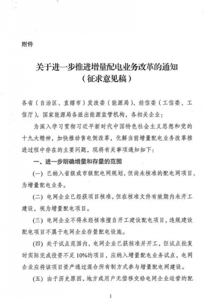 《關于進一步推進增量配電業(yè)務改革的通知(征求意見稿)》