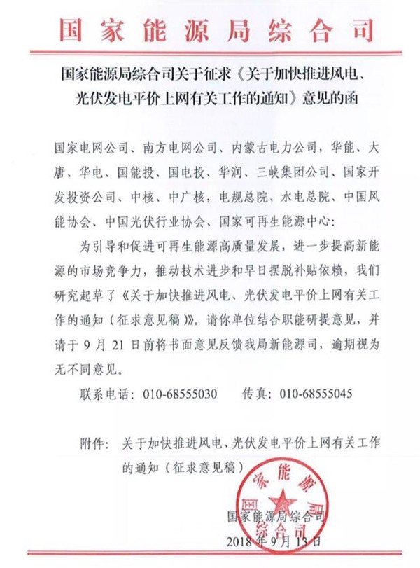 9月14日,從業(yè)內(nèi)獲悉,國(guó)家能源局下發(fā)《關(guān)于加快推進(jìn)風(fēng)電、光伏發(fā)電平價(jià)上網(wǎng)有關(guān)工作的通知(征求意見稿)》。通知指出,國(guó)家能源局對(duì)符合各。▍^(qū)、市)可再生能源建設(shè)規(guī)劃、落實(shí)接網(wǎng)消納條件、符合有關(guān)有關(guān)監(jiān)測(cè)預(yù)警管理要求的項(xiàng)目,不再實(shí)施年度建設(shè)規(guī)模管理。通知強(qiáng)調(diào):1.在資源優(yōu)良、建設(shè)成本