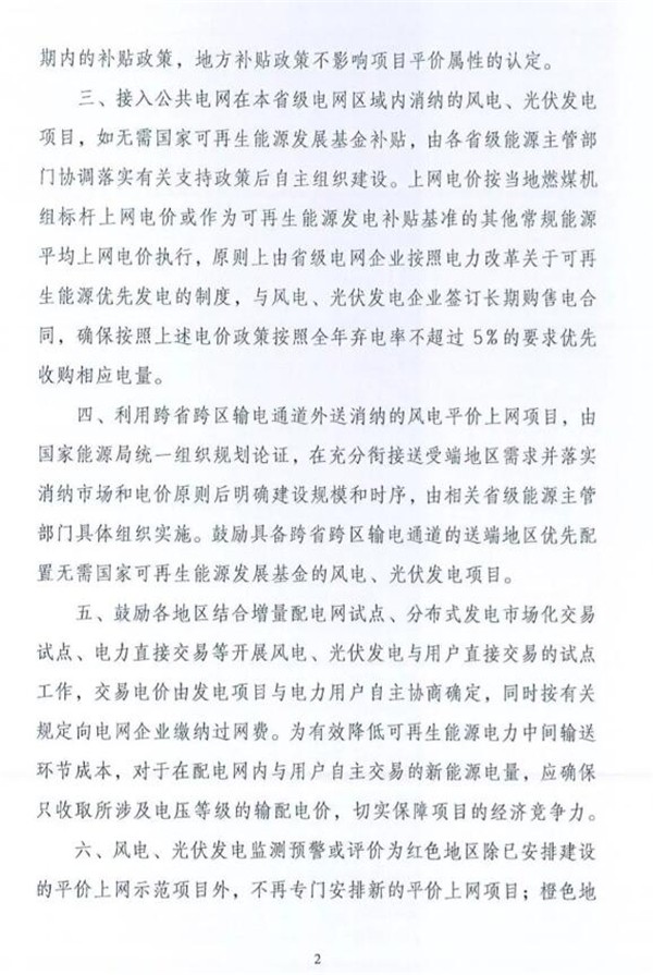 9月14日,從業(yè)內(nèi)獲悉,國(guó)家能源局下發(fā)《關(guān)于加快推進(jìn)風(fēng)電、光伏發(fā)電平價(jià)上網(wǎng)有關(guān)工作的通知(征求意見稿)》。通知指出,國(guó)家能源局對(duì)符合各。▍^(qū)、市)可再生能源建設(shè)規(guī)劃、落實(shí)接網(wǎng)消納條件、符合有關(guān)有關(guān)監(jiān)測(cè)預(yù)警管理要求的項(xiàng)目,不再實(shí)施年度建設(shè)規(guī)模管理。 通知強(qiáng)調(diào): 1.在資源優(yōu)良、建設(shè)成本低、市場(chǎng)條件好的地區(qū),各地區(qū)自行組織開展平價(jià)上網(wǎng)和無(wú)補(bǔ)貼風(fēng)電、光伏發(fā)電項(xiàng)目建設(shè)。各級(jí)地方政府能源主管部門可會(huì)同其他相關(guān)部門自行出臺(tái)一定時(shí)期內(nèi)的補(bǔ)貼政策,地方補(bǔ)貼政策不影響項(xiàng)目平價(jià)屬性的認(rèn)定。 2.上網(wǎng)電價(jià)按當(dāng)?shù)厝济簷C(jī)組標(biāo)桿上網(wǎng)電價(jià)或作為可再生能源發(fā)電補(bǔ)貼基準(zhǔn)的其他常規(guī)能源平均上網(wǎng)電價(jià)執(zhí)行。 電市場(chǎng)化交易試點(diǎn)、電力直接交易等開展風(fēng)電、光伏發(fā)電與用戶直接交易的試點(diǎn)工作,交易電價(jià)由發(fā)電項(xiàng)目與電力用戶自主協(xié)商確定,同時(shí)按有關(guān)規(guī)定向電網(wǎng)企業(yè)繳納過(guò)網(wǎng)費(fèi)。 4.利用跨省跨區(qū)輸電通道外送消納的風(fēng)電平價(jià)上網(wǎng)項(xiàng)目。 5.風(fēng)電、光伏發(fā)電監(jiān)測(cè)預(yù)警或評(píng)價(jià)為紅色地區(qū)除已安排建設(shè)的平價(jià)上網(wǎng)示范項(xiàng)目外,不再專門安排新的平價(jià)上網(wǎng)項(xiàng)目。存在棄風(fēng)棄光問題的地區(qū),項(xiàng)目建設(shè)規(guī)模應(yīng)嚴(yán)格控制,不應(yīng)加劇本地區(qū)新能源電力消納的困難。 具體內(nèi)容如下: ![]() ![]() ![]() ![]() |