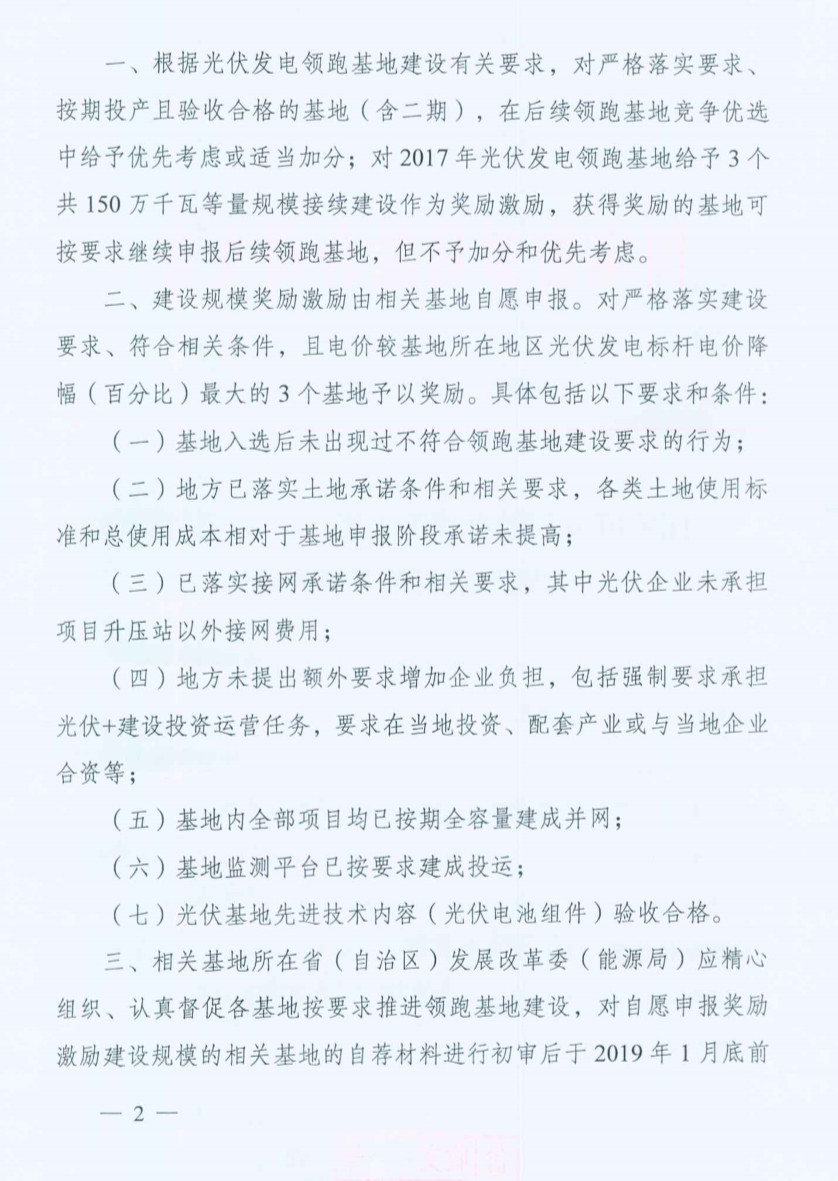 近日,國(guó)家能源局綜合司發(fā)布《關(guān)于光伏發(fā)電領(lǐng)跑基地獎(jiǎng)勵(lì)激勵(lì)有關(guān)事項(xiàng)的通知》,對(duì)2017年光伏發(fā)電基地給予3個(gè)共150萬(wàn)千瓦等量規(guī)模連續(xù)建設(shè)作為獎(jiǎng)勵(lì)激勵(lì)。獲得獎(jiǎng)勵(lì)的基地可以按照要求繼續(xù)申報(bào)后續(xù)領(lǐng)跑基地,但不予加分優(yōu)先考慮。獎(jiǎng)勵(lì)規(guī)模由相關(guān)基地自愿申報(bào)。相關(guān)材料于2019年1月底前向國(guó)家能源局報(bào)送推薦材料。