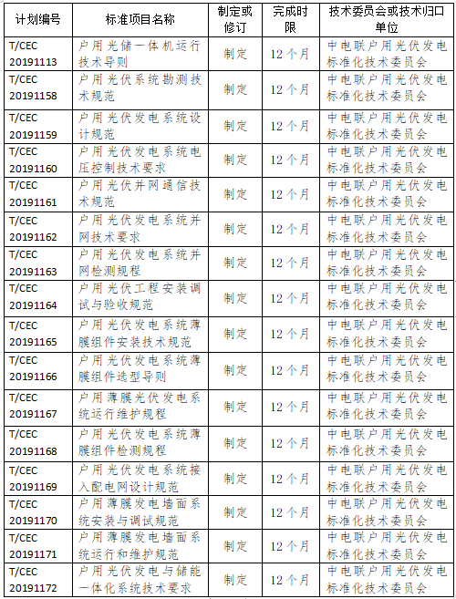 據(jù)中電聯(lián)標(biāo)準(zhǔn)化管理中心消息,中國(guó)電力企業(yè)聯(lián)合會(huì)戶用光伏發(fā)電標(biāo)準(zhǔn)化技術(shù)委員會(huì)(以下簡(jiǎn)稱(chēng)中電聯(lián)戶用光伏標(biāo)委會(huì))于日前正式發(fā)布了第一批戶用光伏發(fā)電標(biāo)準(zhǔn)的制定計(jì)劃。 據(jù)介紹,此次立項(xiàng)的戶用光伏發(fā)電領(lǐng)域標(biāo)準(zhǔn)共有16項(xiàng),涵蓋了戶用光伏發(fā)電從系統(tǒng)設(shè)計(jì)、安裝、調(diào)試、設(shè)備要求、驗(yàn)收到并網(wǎng)的各個(gè)環(huán)節(jié),對(duì)象包括戶用光伏發(fā)電系統(tǒng)(含薄膜光伏發(fā)電系統(tǒng))、戶用光伏與儲(chǔ)能一體化系統(tǒng)、戶用光伏關(guān)鍵設(shè)備等。 本次啟動(dòng)制定工作的標(biāo)準(zhǔn)有:《戶用光儲(chǔ)一體機(jī)運(yùn)行技術(shù)導(dǎo)則》、《戶用光伏系統(tǒng)勘測(cè)技術(shù)規(guī)范》、《戶用光伏發(fā)電系統(tǒng)設(shè)計(jì)規(guī)范》、《戶用光伏發(fā)電系統(tǒng)電壓控制技術(shù)要求》、《戶用光伏并網(wǎng)通信技術(shù)規(guī)范》、《戶用光伏發(fā)電系統(tǒng)并網(wǎng)技術(shù)要求》、《戶用光伏發(fā)電系統(tǒng)并網(wǎng)檢測(cè)規(guī)程》、《戶用光伏工程安裝調(diào)試與驗(yàn)收規(guī)范》、《戶用光伏發(fā)電系統(tǒng)薄膜組件安裝技術(shù)規(guī)范》、《戶用光伏發(fā)電系統(tǒng)薄膜組件選型導(dǎo)則》、《戶用薄膜光伏發(fā)電系統(tǒng)運(yùn)行維護(hù)規(guī)程》、《戶用光伏發(fā)電系統(tǒng)薄膜組件檢測(cè)規(guī)程》、《戶用光伏發(fā)電系統(tǒng)接入配電網(wǎng)設(shè)計(jì)規(guī)范》、《戶用薄膜發(fā)電墻面系統(tǒng)安裝與調(diào)試規(guī)范》、《戶用薄膜發(fā)電墻面系統(tǒng)運(yùn)行和維護(hù)規(guī)范》、《戶用光伏發(fā)電與儲(chǔ)能一體化系統(tǒng)技術(shù)要求》,共計(jì)16項(xiàng),全部計(jì)劃在12個(gè)月內(nèi)完成。 ![]() 中電聯(lián)首批戶用光伏標(biāo)準(zhǔn)立項(xiàng)情況一覽 中電聯(lián)戶用光伏標(biāo)委會(huì)相關(guān)負(fù)責(zé)人表示,隨著國(guó)家發(fā)改委《關(guān)于完善光伏發(fā)電上網(wǎng)電價(jià)機(jī)制有關(guān)問(wèn)題的通知》(發(fā)改價(jià)格[2019]761號(hào))文件的出臺(tái),戶用光伏發(fā)電項(xiàng)目的建設(shè)也將迎來(lái)新一輪的增長(zhǎng)。 “此次戶用光伏發(fā)電標(biāo)準(zhǔn)的立項(xiàng)與編制工作,將為戶用光伏發(fā)電行業(yè)提供技術(shù)指導(dǎo)和標(biāo)準(zhǔn)約束,提升戶用光伏發(fā)電系統(tǒng)的建設(shè)安裝質(zhì)量,促進(jìn)戶用光伏發(fā)電行業(yè)更加規(guī)范發(fā)展! 資料顯示,中電聯(lián)戶用光伏標(biāo)委會(huì)于2018年1月由中電聯(lián)批復(fù)設(shè)立,2018年10月正式組建,目前有委員29名,涵蓋設(shè)計(jì)單位、系統(tǒng)集成與設(shè)備制造企業(yè)、電網(wǎng)公司、科研機(jī)構(gòu)與高校等。中國(guó)電力科學(xué)研究院有限公司作為中電聯(lián)戶用光伏發(fā)電標(biāo)委會(huì)掛靠單位,負(fù)責(zé)中電聯(lián)戶用光伏標(biāo)準(zhǔn)的立項(xiàng)需求征集、審核推薦以及標(biāo)準(zhǔn)制修訂歸口管理工作。 |