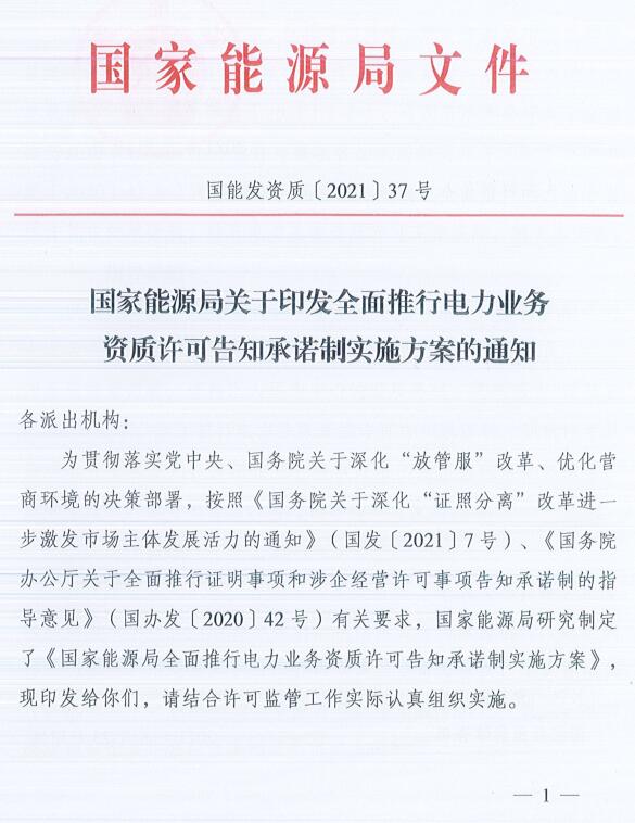 國家能源局全面推行電力業(yè)務(wù)資質(zhì)許可告知承諾制實施方案為深化“證照分離”改革,優(yōu)化營商環(huán)境,進一步激發(fā)市場主體發(fā)展活力,按照《國務(wù)院關(guān)于深化“證照分離”改革進一步激發(fā)市場主體發(fā)展活力的通知》(國發(fā)〔2021〕7號)、《國務(wù)院辦公廳關(guān)于全面推行證明事項和涉企經(jīng)營許可事項告知承諾制的指導意見》(國辦發(fā)〔20