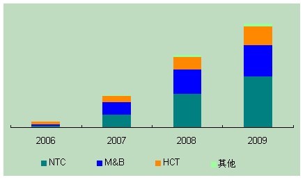 在國內(nèi)光伏行業(yè)切片領域,到2009年底國際上影響力最大的三家設備供應商在中國市場產(chǎn)能中差不多是三分天下,NTC的份額稍微高一點。下圖是國內(nèi)線切割設備數(shù)量的一個變化趨勢圖。其他包括國內(nèi)品牌和國外進口的其他小品牌。