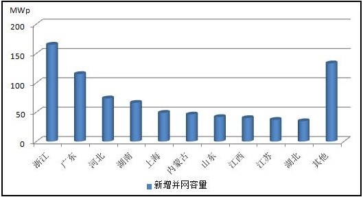分布式光伏。主要分布在電力負荷比較集中的中東部地區(qū),華東和華北地區(qū)累計并網(wǎng)容量分別為145萬和49萬千瓦,占全國分布式光伏的60%。排名前三的省份分別為浙江、廣東和河北省,并網(wǎng)容量分別達到16萬千瓦、11萬千瓦和7萬千瓦,三省之和占全國分布式光伏并網(wǎng)總?cè)萘康?0%以上。各。ㄗ灾螀^(qū)、直轄市)分布式光伏情況見附表2。