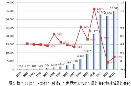 從全球光伏電池的產(chǎn)量變動情況,可以一窺政策及經(jīng)濟環(huán)境變化對于太陽電池產(chǎn)量的影響。從圖1可以看到,截至到2012年世界光伏電池產(chǎn)量的變化,這里2013年的數(shù)據(jù)是估計的,因為到目前為止世界兩大太陽電池雜志(PhotonInternational和PVNews)均未給出2013年全球光電池的數(shù)據(jù)。