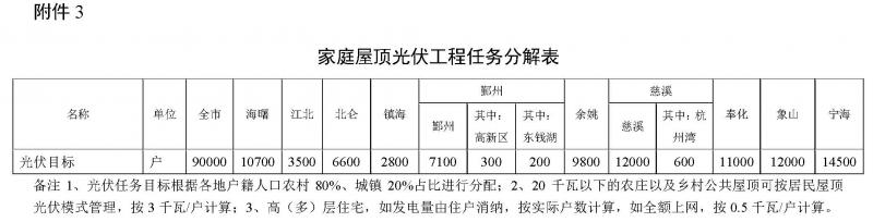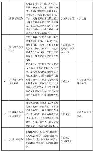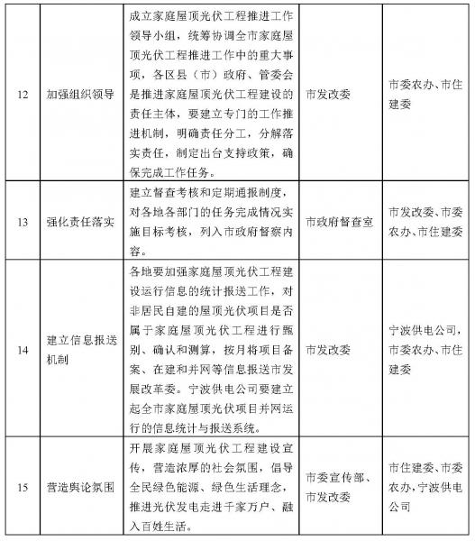 四、其它 本方案自發(fā)布之日起實(shí)施。各地政府可根據(jù)本轄區(qū)的實(shí)際情況,參照本實(shí)施方案,研究制定當(dāng)?shù)氐耐七M(jìn)實(shí)施方案。 附件: 一、寧波市家庭屋頂光伏工程推進(jìn)工作領(lǐng)導(dǎo)小組及辦公室成員名單 二、寧波市家庭屋頂光伏工程推進(jìn)工作市級(jí)單位任務(wù)分解表 三、各地家庭屋頂光伏工程建設(shè)任務(wù)分解表 附件1 寧波市家庭屋頂光伏工程推進(jìn)工作領(lǐng)導(dǎo)小組及辦公室成員名單 組 長(zhǎng) 宋越舜 市委常委、常務(wù)副市長(zhǎng) 副組長(zhǎng) 王洪平 市政府副秘書長(zhǎng) 彭朱剛 市發(fā)改委主任 成 員 李 可 市委宣傳部 舒 翔 市委農(nóng)辦 王光旭 市發(fā)改委 夏海明 市住建委 杜永華 市經(jīng)信委 王 曉 市財(cái)政局 市質(zhì)監(jiān)局 萬江波 市國(guó)土局 市農(nóng)業(yè)局 邵必文 市林業(yè)局 市城管局 續(xù) 鋒 市金融辦 孫志能 寧波供電公司 海曙區(qū)政府 江北區(qū)政府 楊小平 鎮(zhèn)海區(qū)政府 縢安達(dá) 北侖區(qū)政府 王兆波 鄞州區(qū)政府 魏建根 奉化區(qū)政府 余姚市政府 傅貴榮 慈溪市政府 王軍海 寧?h政府 石堅(jiān)定 象山縣政府 俞承豪 國(guó)家高新區(qū)管委會(huì) 史建范 杭州灣新區(qū)管委會(huì) 任君達(dá) 東錢湖旅游度假區(qū)管委會(huì) 領(lǐng)導(dǎo)小組辦公室設(shè)在市發(fā)改委,由彭朱剛兼任辦公室主任,王光旭、舒翔、夏海明兼任辦公室副主任,辦公室負(fù)責(zé)領(lǐng)導(dǎo)小組日常工作。 ![]() ![]() ![]() ![]() |