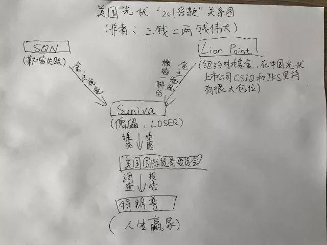 5. “201條款”的未來(lái) 事情的最新進(jìn)展是USITC已經(jīng)展開(kāi)正式調(diào)查,將在9月22日之前做出損害認(rèn)定,即確定是否構(gòu)成了傷害,然后在11月13日前向總統(tǒng)提交報(bào)告,而根據(jù)以往的經(jīng)驗(yàn),特朗普收到報(bào)告后,很有可能在15天之內(nèi)就會(huì)做出決定。 但要獲得最終批準(zhǔn),此次“201條款”的請(qǐng)?jiān)溉杂性S多困難要克服。 通常情況下,組件在電站的資本支出中占40%左右,如果進(jìn)口組件價(jià)格上漲超過(guò)100%,意味著建電站的金主爸爸們未來(lái)可能要多花40%以上的費(fèi)用,修建光伏電站的意愿肯定會(huì)大幅降低。 上個(gè)月我參加了某家國(guó)外券商舉行的電話(huà)會(huì)議,與會(huì)者包括美國(guó)光伏產(chǎn)業(yè)協(xié)會(huì)的前會(huì)長(zhǎng)Rhone Resch,他在會(huì)中提到,目前光伏制造環(huán)節(jié)的從業(yè)人員數(shù)量是3.8萬(wàn)人,而下游電站安裝環(huán)節(jié)的從業(yè)人員數(shù)量是13.7萬(wàn)人。那么從政治的角度出發(fā),特朗普是否會(huì)為了少數(shù)人去犧牲多數(shù)人? 再者,眾所周知,特朗普力推的是傳統(tǒng)化石能源,甚至在前兩天還宣布美國(guó)將退出巴黎氣候協(xié)定,那么他是否會(huì)為了屬于新能源的光伏行業(yè),不惜和中國(guó)展開(kāi)貿(mào)易戰(zhàn)? 但另外一方面,曾參與美國(guó)“雙反”和鋼鐵“201條款”的貿(mào)易專(zhuān)業(yè)律師John Gurley,在電話(huà)會(huì)議里指出,通常這種需要總統(tǒng)批準(zhǔn)的請(qǐng)?jiān),在提交前都已?jīng)和白宮打過(guò)招呼,所以USITC受理此案,說(shuō)明白宮方面是默許的,最終大概率會(huì)采取相關(guān)措施,只是力度未必有Suniva要求的那么大。 6. 半路殺出的程咬金 前面提到,SQN曾是DIP貸款唯一的提供者,但后來(lái)又加入了一家名為L(zhǎng)ion Point的對(duì)沖基金。 經(jīng)過(guò)我的調(diào)查,Lion Point在阿特斯太陽(yáng)能(代碼:CSIQ)持有價(jià)值約2,500萬(wàn)美元的股票和3,800萬(wàn)美元的可轉(zhuǎn)債,在晶科能源(代碼:JKS)持有價(jià)值約1,200萬(wàn)美元的股票,而在出口給美國(guó)的中國(guó)光伏廠(chǎng)商里,CSIQ和JKS正是最大的兩家。 所以我推測(cè)Lion Point的舉動(dòng)是為了在這起貿(mào)易案件中爭(zhēng)取主動(dòng)權(quán),通過(guò)對(duì)Suniva施加影響,保護(hù)自己持股公司的權(quán)益。Lion Point的相關(guān)利益合計(jì)達(dá)到7,500萬(wàn)美元(基金總規(guī)模不到6億美元的樣子),提供給Suniva的DIP貸款不過(guò)才130萬(wàn)美元,且是最高償還等級(jí),這筆投資還是值得的。 隨著更多的利益關(guān)聯(lián)方浮出水面,整個(gè)事情變得越來(lái)越有意思。 最后附上一張關(guān)系圖。 ![]() 利益聲明:本人持有CSIQ、FSLR和JKS的多頭倉(cāng)位。