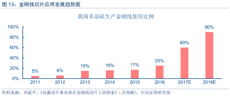 硅料附加值高,盡享行業(yè)紅利 從利潤分配來看,上游利潤回升,中游競爭激烈,下游收益穩(wěn)定。多晶硅環(huán)節(jié)由于生產(chǎn)技術(shù)復(fù)雜、投產(chǎn)周期長,具有較高的進(jìn)入壁壘,導(dǎo)致競爭格局穩(wěn)健,利潤較高;而下游電站收益由于國家補(bǔ)貼且根據(jù)成本保障基本的投資回報,收益也很穩(wěn)定;但中游電池和組件由于進(jìn)入門檻較低,劇烈擴(kuò)張迅速導(dǎo)致產(chǎn)能過剩,競爭較為激烈,收益相對較低。同時,由于上游集中度高,導(dǎo)致中游議價能力相對較弱,利潤受到擠壓。 硅料需求量居高不下,但自給率僅為56.82%,仍有進(jìn)口替代空間。隨著光伏市場需求上升、成本下降,預(yù)計硅料需求量將保持上漲趨勢。 ![]() 根據(jù)Energy Trend,全球太陽能產(chǎn)業(yè)最上游端的硅料有80%以上在中國加工為硅片,隨著全球光伏裝機(jī)規(guī)模持續(xù)增長,國內(nèi)硅料需求將保持增長。但我國硅料產(chǎn)量僅占全球產(chǎn)量的50%左右,國產(chǎn)多晶硅無法滿足下游需要,硅料進(jìn)口需求持續(xù)較高。 2016年我國硅料進(jìn)口量約14.10萬噸,同比增長8.55%,其中,從韓國、德國、美國分別進(jìn)口7.00萬噸、3.57萬噸、0.56萬噸,占比分別為49.7%、25.3%、4.0%。2017年H1硅料進(jìn)口量達(dá)7.28萬噸。 ![]() 我們預(yù)計全球2017、2018、2019年新增裝機(jī)80GW、90GW、100GW,中國組件占比80%,組件生產(chǎn)企業(yè)的平均單瓦硅耗量約4.9g/W,2017年我國硅料市場需求量約為35萬噸,即使考慮金剛線替代硅耗量下降至4.5g/W,則需求量仍達(dá)到32萬噸,進(jìn)口替代空間較大,對于像保利協(xié)鑫這樣的全球領(lǐng)先硅料廠商來說,無疑是潛在市場。 ![]() 國內(nèi)企業(yè)硅料生產(chǎn)成本下降,提升了國產(chǎn)硅料的競爭優(yōu)勢。與國際上在化工廠基礎(chǔ)上建設(shè)的硅料生產(chǎn)企業(yè)相比,國內(nèi)企業(yè)多為跨界進(jìn)入,且開始生產(chǎn)時間較短,在工藝循環(huán)上與國際廠家相差較多,具有較大的成本差距。 ![]() 近年來隨著冷氫化改良西門子工藝技術(shù)的提升,技改去瓶頸等措施的實(shí)施,以及先進(jìn)企業(yè)通過布局產(chǎn)能在低電價區(qū)域,國內(nèi)企業(yè)的硅料生產(chǎn)成本大幅降低,部分先進(jìn)企業(yè)的完全生產(chǎn)成本已經(jīng)降低到了7萬元/噸以下,大大增強(qiáng)了國產(chǎn)硅料的競爭優(yōu)勢。 金剛線+黑硅+PERC帶動多晶復(fù)蘇 目前,我國多晶硅硅錠的主流切割方式依然是砂漿鋼線切割技術(shù)。在金剛線應(yīng)用于單晶硅切割后,多晶領(lǐng)域金剛線切割的試驗(yàn)也一直在推進(jìn),但始終未能進(jìn)行大范圍推廣,關(guān)鍵原因有兩個: 一、多晶硅晶體含有硬點(diǎn)與雜質(zhì),導(dǎo)致切割斷線概率增加; 二、金剛線切割多晶后,硅片表面損傷層淺,后續(xù)制絨工藝出現(xiàn)困難,影響電池發(fā)電效率。 ![]() 自2016年起,新型“制絨”技術(shù)如干法黑硅技術(shù)、濕法黑硅技術(shù)以及新型添加劑制絨技術(shù)取得良好突破,2017年至今這些技術(shù)的逐漸成熟穩(wěn)定使得金剛線切割多晶影響電池效率的主要障礙得到解決,金剛線切多晶硅硅片的技術(shù)推廣呈現(xiàn)井噴式發(fā)展。 ![]() 與此同時,通過PERC技術(shù)(一種有效提高電池效率的技術(shù))與黑硅技術(shù)的疊加整合,多晶硅電池的轉(zhuǎn)換效率得到極大提升,再加上金剛線切割的低成本高效優(yōu)勢,多晶產(chǎn)品競爭力得到大幅增強(qiáng)。黑硅制絨方式+PERC技術(shù)+金剛線達(dá)到1+1+1>3的優(yōu)勢。 ![]() 目前,行業(yè)正加速推進(jìn)多晶硅“金剛線切割+黑硅制絨+PERC”模式的應(yīng)用,以提高多晶電池產(chǎn)品的效率且大幅度降低成本。眾多企業(yè)的實(shí)踐表明,PERC、黑硅制絨技術(shù)、金剛線切割多晶硅片的結(jié)合可以達(dá)到技術(shù)互補(bǔ),從成本、電流、電壓多處入手,聯(lián)合實(shí)現(xiàn)多晶硅電池轉(zhuǎn)化效率的更大幅度提升。而且,多晶效率的進(jìn)步是在沒有增加成本的基礎(chǔ)上,金剛線切技術(shù)的大規(guī)模推廣基本抵消了黑硅和PERC技術(shù)增加的成本。根據(jù)測算,多晶黑硅PERC與單晶PERC電池轉(zhuǎn)換效率相差0.7%左右,但是成本卻相差近1元/片,多晶性價比優(yōu)勢明顯,反攻大潮迅速開啟。 綜上所述,目前是多晶電池發(fā)展的重要契機(jī),有望重奪市場占有率。同時硅料是光伏產(chǎn)業(yè)鏈附加值最高的環(huán)節(jié),資產(chǎn)規(guī)模大門檻高,公司作為多晶硅料和硅片龍頭企業(yè),市場地位顯著,盡享行業(yè)紅利。 ![]() |