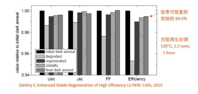![]() UNSW(新南威爾士大學(xué))認(rèn)為(光致)再生過程的機(jī)理在于促使P型硅中存在的H+轉(zhuǎn)化為H0,H0可以鈍化BO+缺陷乃至金屬離子如Fei+、Cri+,商業(yè)化的光致再生設(shè)備因需要高生產(chǎn)速率,因此需要利用到高強(qiáng)度的光照(如激光)以在幾秒鐘內(nèi)完成再生過程。如下報(bào)告列舉了5家提供光致再生(LIR,Lightinduecdregeneration)設(shè)備的企業(yè),其設(shè)備均有很好的處理效果。 ![]() 國內(nèi)的晶寶、時創(chuàng)、昊建等均開發(fā)了電注入(電致再生)設(shè)備,不同于光注入設(shè)備需要在電池端與在線生產(chǎn),電注入設(shè)備可以離線布置在電池端或組件端,多個電池片堆疊通電處理,在制造端也得到了大規(guī)模的應(yīng)用。 另外,摻Ga的P型硅與摻磷的N型硅則可以根本上杜絕了“B-O”衰減,也可以解決單晶PERC技術(shù)的光衰風(fēng)險(xiǎn)。因此單晶PERC技術(shù)規(guī)模應(yīng)用在理論上不存在問題,卻對硅片品質(zhì)與電池技術(shù)提出了更高的要求,光伏電站投資者需要選擇技術(shù)可靠的供應(yīng)商以避免風(fēng)險(xiǎn)。 3.多晶PERC光衰與LeTID 根據(jù)以下2012年的研究,低氧與摻Ga均無法解決多晶PERC電池的光衰問題,并展示了不同溫度下測試光衰的差別,75oC下的光衰明顯高于25oC的結(jié)果,而75oC是組件戶外工作時可能出現(xiàn)的溫度。 ![]() 因此Q-Cells在15年命名的LeTID(Light andelevated Temperature Induced Degradation,光與升溫導(dǎo)致的衰減)并不是一個新的概念,不少文獻(xiàn)還是堅(jiān)持使用LIDinmc-silicon(多晶光衰)來描述同一現(xiàn)象。Q-Cells發(fā)現(xiàn)多晶PERC電池的開路電壓衰減在95oC高載流子注入的情況下在800小時后恢復(fù)至約99%,表明了多晶PERC電池再生態(tài)處理理論上的可行性,但由于耗時非常久,產(chǎn)業(yè)化付出的成本就會很高。 |
