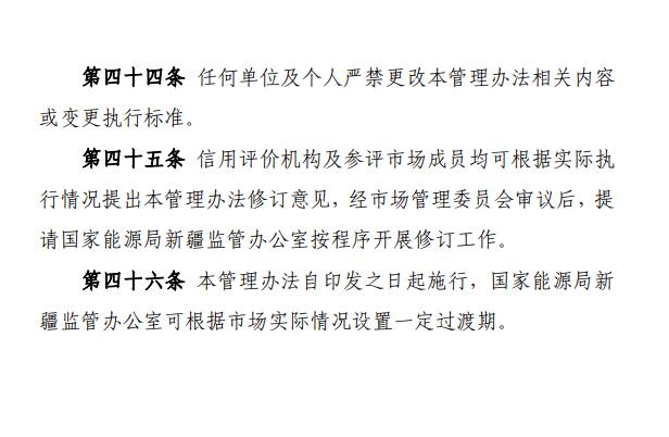 9月22日,國(guó)家能源局新疆監(jiān)管辦印發(fā)《新疆電力市場(chǎng)交易信用評(píng)價(jià)及評(píng)定管理辦法(試行)》的通知,依據(jù)《電力法》等法律法規(guī),結(jié)合新疆實(shí)際,制定本管理辦法。本管理辦法適用于新疆電力市場(chǎng)成員包括各類發(fā)電企業(yè)、售電公司(含擁有配電網(wǎng)運(yùn)營(yíng)權(quán)的售電公司、獨(dú)立的售電公司)、電網(wǎng)企業(yè)(含各局域電網(wǎng)企業(yè)、躉售縣(團(tuán)場(chǎng)