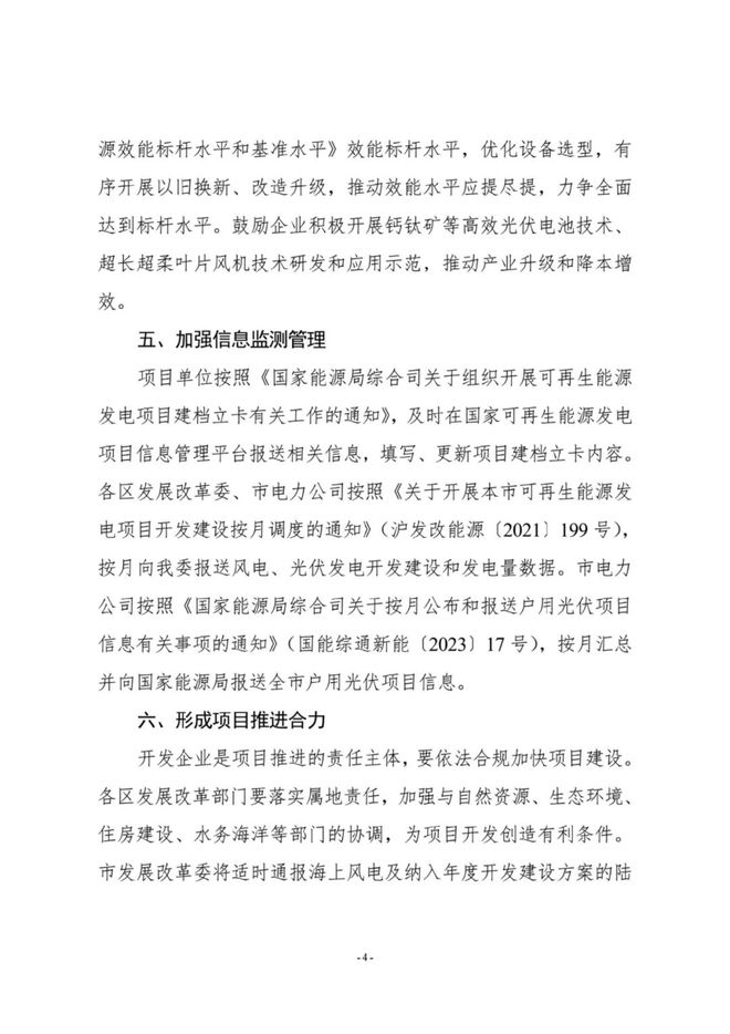 3月30日,上海市發(fā)改委發(fā)布《關(guān)于做好2023年風(fēng)電、光伏發(fā)電開發(fā)建設(shè)有關(guān)事項(xiàng)的通知》!锻ㄖ分赋,海上風(fēng)電由市發(fā)展改革委通過競爭配置方式公開選擇項(xiàng)目投資主體。陸上風(fēng)電、光伏電站(裝機(jī)容量6兆瓦及以上的全額上網(wǎng)光伏項(xiàng)目)納入年度建設(shè)方案管理,由各區(qū)發(fā)展改革委組織符合條件、有投資意愿的企業(yè)開展年度開發(fā)建設(shè)方