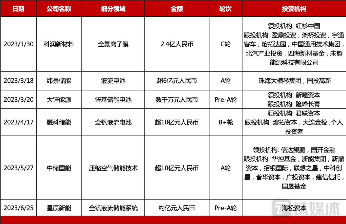 究竟哪條賽道才是“吸金獸”? 一些機構甚至預測,到2030年儲能市場規(guī)模將達10萬億元以上。 如此大的市場,雖說投資人愿意多條線押注,但畢竟“押注”有大有小,究竟哪條賽道才是里面名副其實的“吸金獸”? 答案或許是:長時儲能賽道。 什么是長時儲能?在國內(nèi),一般將連續(xù)運(放電)時間為不低于4小時的儲能系統(tǒng)稱為長時儲能。 當下,我國儲能市場以儲能時長在2-4小時之間的短時儲能系統(tǒng)為主,但這并不能滿足電力系統(tǒng)跨天、跨月、乃至跨季、跨年的儲能需要。 “要完成雙碳目標就意味著新能源的裝機量要在二三十年的時間里提升到整體裝機容量的60-70%,甚至有可能更高,F(xiàn)在的光伏電廠或者說風電廠的裝機容量提升其實非常快,因為它的建設周期可能只要8-10個月,但電力運輸特別是長距離的電力運輸是需要特高壓網(wǎng)絡,而一條特高壓線路的建設周期是4年,所以新能源上的越快,發(fā)電企業(yè)的電到底去給誰用、放到哪里、存到哪里,就越會成為一個尖銳的問題。”周輝解釋說。 長時儲能委員會(LDES)與麥肯錫在2021年底聯(lián)合發(fā)布的報告預計,到2040年在全球范圍內(nèi)需要部署85TWh-140TWh的長時儲能容量,存儲10%的發(fā)電量,累計帶動投資1.53萬億美元。 傳統(tǒng)的長時儲能技術以抽水蓄能為主。其工作原理是在電力負荷低谷期將水從下池水庫抽到上池水庫時將電能轉(zhuǎn)化成重力勢能儲存起來,在負荷高峰時利用反向水流發(fā)電。 據(jù)中關村儲能產(chǎn)業(yè)技術聯(lián)盟數(shù)據(jù)顯示,截止到2022年底,中國已投運的電力儲能項目累計裝機達59.4吉瓦,同比增長37%。其中,抽水蓄能占據(jù)最大比重,累計裝機達46.1吉瓦。 然而抽水蓄能本身存在局限,比如能量密度低、地理條件限制嚴重等。在長時儲能需求爆發(fā)的背景下,人們不得不尋找更新的儲能技術,比如電化學儲能以及壓縮空氣儲能。 在上半年眾多的投融資事件中,鈦媒體App注意到其中有多起超5億的項目,其中,中儲國能和大連融科儲能的金額都超過10億,緯景儲能在今年3月拿下超6億融資。 中儲國能是中國科學院工程熱物理研究所先進壓縮空氣儲能技術的產(chǎn)業(yè)化公司,大連融科儲能和緯景儲能則是液流電池技術研發(fā)公司。 ![]() 2023年1-6月部分長時儲能相關投融資事件 不過,由于新型長時儲能技術路線眾多,究竟用哪條路線行業(yè)內(nèi)并未出現(xiàn)共識。目前,儲能技術日新月異,鈉離子電池、液流電池、重力儲能、飛輪儲能、壓縮空氣儲能等產(chǎn)業(yè)化也在不斷加速,示范項目落地更是層出不窮。