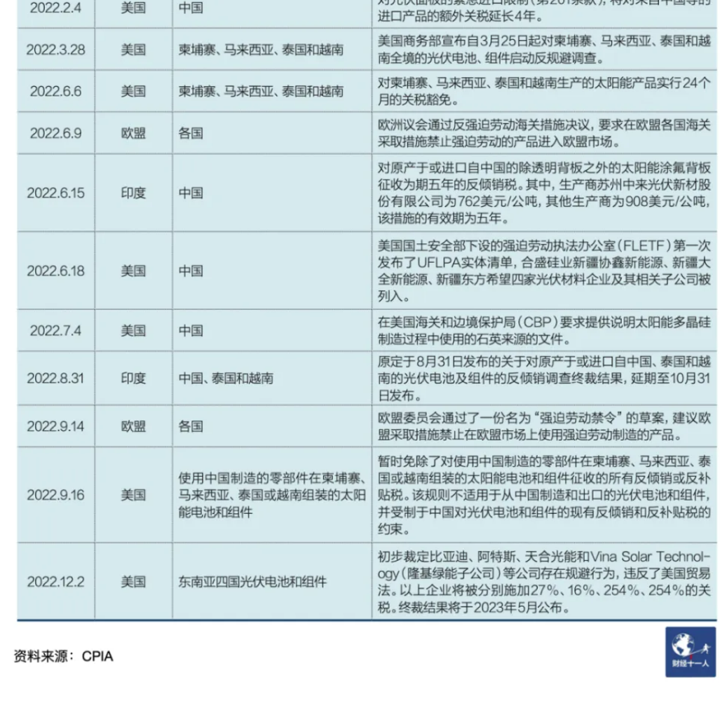 海外市場:至關(guān)重要、更加復(fù)雜當(dāng)前,中國企業(yè)在光伏行業(yè)的各個環(huán)節(jié)都絕對領(lǐng)先,中國光伏企業(yè)的技術(shù)和產(chǎn)能優(yōu)勢,支撐了全球的能源轉(zhuǎn)型。 根據(jù)光伏行業(yè)協(xié)會的數(shù)據(jù),2022年,中國光伏企業(yè)在多晶硅料、硅片、電池片、組件這四個主要環(huán)節(jié)的產(chǎn)能在全球占比都超過了80%,產(chǎn)量占比都超過85%。其中硅片尤為突出,中國產(chǎn)能、產(chǎn)量占比都超過97%。 2022年全球光伏產(chǎn)品產(chǎn)能 產(chǎn)量及中國產(chǎn)品在全球的占比 ![]() 根據(jù)光伏行業(yè)協(xié)會的數(shù)據(jù),2022年,中國光伏產(chǎn)品出口依然強勁增長,總出口額512.5億美元,同比增長80.3%,其中組件產(chǎn)品出口是大頭,占比82.6%,出口量達到153.6GW。與之相比,2022年中國新增光伏裝機為87.41GW(對應(yīng)組件需求約104.5GW),國際市場需求是國內(nèi)市場需求的1.47倍。 國際市場廣闊的增長空間,中國光伏企業(yè)的技術(shù)、產(chǎn)能和成本優(yōu)勢,都對消化當(dāng)前正在擴張的產(chǎn)能有重要作用。而國際市場一旦受到抑制,就會加重國內(nèi)企業(yè)的過剩形勢。 出口區(qū)域方面,深陷能源危機而加速能源轉(zhuǎn)型的歐洲是第一大市場,2022年占中國光伏產(chǎn)品出口總額的46%,同比大增114.9%,其中出口歐洲的轉(zhuǎn)運國荷蘭是第一大出口目的地。 美國方面,為了規(guī)避關(guān)稅壁壘,頭部組件廠商紛紛在東南亞國家設(shè)廠,從國內(nèi)進口硅片、電池在東南亞生產(chǎn)組件再出口至美國,這也帶動了硅片、電池這類上游產(chǎn)品出口增速,尤其是電池出口同比大增130.7%。據(jù)光伏行業(yè)協(xié)會數(shù)據(jù),今年上半年,這一趨勢仍在延續(xù),硅片、電池片的出口占比有所增加,且主要出口至東南亞國家。東南亞國家也迅速成為美國進口光伏組件的主要來源國,而這背后主要是中國光伏企業(yè)在東南亞的產(chǎn)能。 ![]() 這一變化的背后,是中國光伏企業(yè)面臨著更加復(fù)雜的出口形勢。 俄烏戰(zhàn)爭深刻改變了全球能源格局,能源轉(zhuǎn)型提速,能源安全更受重視。過去歐洲依賴俄羅斯的油氣資源,而在能源轉(zhuǎn)型提速之后,中國在光伏和新能源車產(chǎn)業(yè)鏈的主導(dǎo)地位變得更加矚目。 歐洲、美國、印度是全球最重要的幾大市場,如今都在不斷對中國出口光伏產(chǎn)品設(shè)置貿(mào)易壁壘,并努力打造自己的光伏產(chǎn)業(yè)鏈。這些壁壘和本地化的努力,未來將對中國光伏產(chǎn)品出口前景帶來影響。 2022年部分經(jīng)濟體實施的貿(mào)易壁壘政策 涉及美國、歐盟、印度等海外市場 ![]() 國際能源署在2022年7月發(fā)布的《光伏全球產(chǎn)業(yè)鏈報告》中認(rèn)為,光伏供應(yīng)鏈集中帶來脆弱性,給能源轉(zhuǎn)型帶來潛在挑戰(zhàn)。迄今為止,在全球范圍內(nèi),支持光伏發(fā)電的政策主要集中在增加需求和降低成本上。然而,還需要有彈性和可持續(xù)的供應(yīng)鏈,以確保在全球范圍內(nèi)及時、經(jīng)濟高效地交付太陽能電池板。因此,各國政府需要將注意力轉(zhuǎn)向確保太陽能光伏供應(yīng)的安全,將其作為清潔能源轉(zhuǎn)型的一個組成部分。各國應(yīng)評估其國內(nèi)太陽能光伏供應(yīng)鏈的脆弱性和風(fēng)險,并制定應(yīng)對策略和行動。 美國《通脹削減法案》(IRA)正在努力構(gòu)建國內(nèi)的光伏產(chǎn)業(yè)鏈。2022年8月,美國總統(tǒng)拜登簽署《IRA》,根據(jù)該法案,未來10年,美國將投入3690億美元用于能源安全和氣候變化。其中在光伏制造端,IRA 對光伏全產(chǎn)業(yè)鏈都有補貼,至2029年,IRA對對組件補貼7美分/瓦,電池4美分/瓦,硅片12美元/平方米,多晶硅料3美元/公斤。 IRA對光伏制造端的補貼明細(xì) ![]() 據(jù)美國太陽能行業(yè)協(xié)會(SEIA)和伍德麥肯茲(Wood Mackenzie)在2023年6月聯(lián)合發(fā)布的《二季度美國太陽能市場洞察》報告,由于美國后續(xù)政策要求不僅組件需要本地化生產(chǎn),也對上游原材料提出本地化要求,而當(dāng)前美國并沒有電池片產(chǎn)能,預(yù)計這會催生電池領(lǐng)域的投資,進一步促進光伏供應(yīng)鏈的本地化,預(yù)計到2026年,美國本土電池片產(chǎn)能將增長到20GW,本土組件產(chǎn)能達到60GW。 美國電池、組件產(chǎn)能增長預(yù)測 ![]() 印度是中國和美國之外唯一的10GW級光伏市場。印度光伏組件80%以上從中國進口。為了擺脫現(xiàn)狀,印度政府出臺一系列支持政策,既包括設(shè)立貿(mào)易保護政策,也制定了對本土光伏制造業(yè)的補貼政策。 印度政府2021年4月發(fā)布生產(chǎn)制造激勵(PLI)計劃,計劃在五年內(nèi)投入450億盧比,支持建立10GW的光伏綜合制造廠。2022年9月,印度把PLI計劃的投資額從450億盧比增至2400億盧比,大力推動光伏產(chǎn)品本土化生產(chǎn)。 歐盟委員會提出的《凈零工業(yè)法案》提出,對光伏產(chǎn)業(yè)將“推動投資、刺激需求、促進制造業(yè)和項目的許可、以及提升和再培訓(xùn)歐洲勞動力”。 復(fù)雜的地緣政治形勢下,補貼大戰(zhàn)已經(jīng)開啟,國際光伏市場將不再是單純的經(jīng)濟競爭。據(jù)彭博新能源財經(jīng)測算,《IRA》對光伏每個環(huán)節(jié)的稅收抵免疊加之后,理論上從多晶硅到組件的整個生產(ch