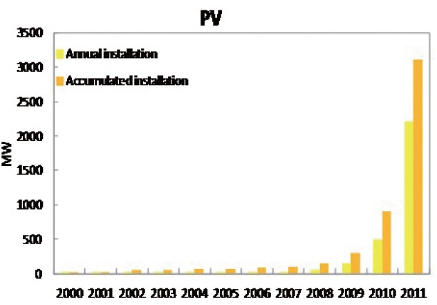 圖1、光伏發(fā)電年裝機(jī)容量和累計(jì)發(fā)電裝機(jī)容量( 單位: 兆瓦M(jìn)W)