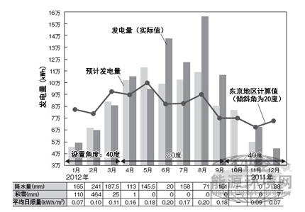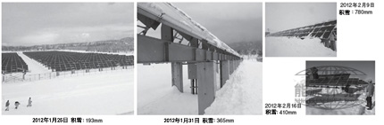 圖3 發(fā)電量超過預(yù)期 新潟東部太陽能電站(1號系統(tǒng))的發(fā)電量預(yù)測值與實際值比較。撰寫本文時,2012年10月的實際值尚未公開。(本圖由《日經(jīng)電子》根據(jù)新潟縣的資料作成) 從實際發(fā)電量來看,冬季(2011年11月~2012年1月)和夏季(2012年4月、6月~9月)均超過了預(yù)測的月發(fā)電量。尤其是2012年6月和8月,發(fā)電量大幅超過了預(yù)測值。新潟縣企業(yè)局解釋,原因是“比往年雨水少、晴天多”。因11月~1月的發(fā)電量超過了預(yù)期,說明冬季將模塊角度改為40度的措施產(chǎn)生了效果。新潟縣企業(yè)局冬季拍攝的照片也表明,堆積在模塊面的積雪很少(圖4)。據(jù)稱,即便有積雪,只要氣溫略有上升,積雪也會從模塊上滑落。因1.8米高的架臺產(chǎn)生了效果,模塊并沒有被落下的積雪埋沒。2012年2月,雖然阿賀野市周邊地區(qū)的積雪深度超過了過去29年間的最大年平均值550mm,但模塊并沒有被雪埋沒,仍然能夠繼續(xù)發(fā)電。