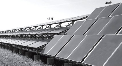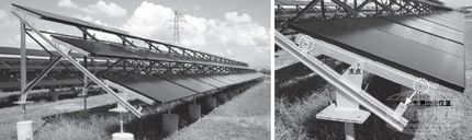 圖8 可輕松改變模塊的角度 通過改變固定模塊的位置,可將模塊角度改成18度和48度。因為采用了以支點為中心改變角度的機構(gòu),所以調(diào)整時不需要很大力氣。 在模塊之間設(shè)置間隙,還有助于減輕風力的影響,從而簡化架臺設(shè)計。架臺底座采用了安裝較為容易的施工方式,即打入多個鋼管樁,并以混凝土固定地面部分。通過動腦筋想辦法,縮短了施工期,該工程于2012年7月1日開工,8月22日竣工。 窪倉介紹說,之所以將太陽能電池模塊的設(shè)置角度設(shè)定為18度和48度,是因為相對于33度的基礎(chǔ)架臺,±15度“比較容易實現(xiàn)”。目前正在實地驗證各個角度的發(fā)電特性。2012年9月記者采訪該發(fā)電站時,大部分模塊都被設(shè)成了18度,部分模塊則為了驗證效果而設(shè)成了48度(圖9)。