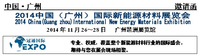 為使國(guó)內(nèi)新能源材料上下游企業(yè)及時(shí)了解掌握國(guó)內(nèi)外新能源材料業(yè)發(fā)展動(dòng)態(tài),同時(shí)也為國(guó)內(nèi)外新能源材料企業(yè)搭建一個(gè)連續(xù)化、專業(yè)化、高水平、品牌化的交流平臺(tái),中國(guó)新材料技術(shù)協(xié)會(huì)、上海冠通展覽策劃有限公司將于2014年11月26日-28日在中國(guó)進(jìn)出口商品交易會(huì)展館(廣交會(huì)琶洲展館)召開(kāi)“2014中國(guó)(廣州)國(guó)際新能源材料展覽會(huì)”