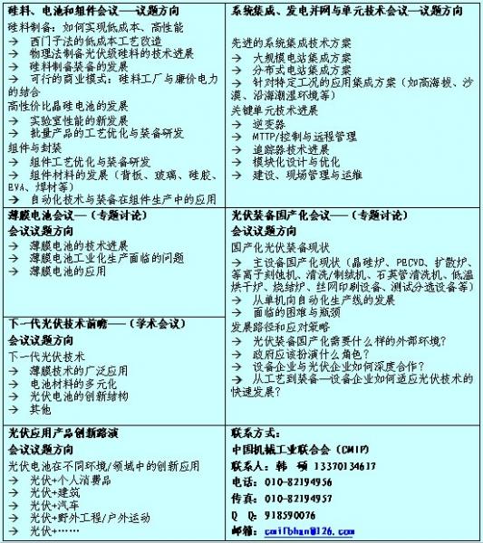 2015(第二屆)中國(guó)能源峰會(huì)—光伏大會(huì) 主題:更低的度電成本、更高的電站質(zhì)量 時(shí)間:2015年9月8-10日 地點(diǎn):中國(guó)國(guó)際展覽中心新館會(huì)議室 主辦單位:中國(guó)機(jī)械工業(yè)聯(lián)合會(huì) 支持單位:中國(guó)循環(huán)經(jīng)濟(jì)協(xié)會(huì)可再生能源專業(yè)委員會(huì) 國(guó)家發(fā)改委國(guó)際合作中心能源研究所 中國(guó)可再生能源行業(yè)協(xié)會(huì) 中國(guó)機(jī)電產(chǎn)品進(jìn)出口商會(huì)太陽能光伏產(chǎn)品分會(huì) 合作媒體:新浪財(cái)經(jīng) 中國(guó)能源報(bào) 《能源》雜志社 經(jīng)過長(zhǎng)期的發(fā)展,光伏度電成本已經(jīng)逐步趨向常規(guī)電站發(fā)電成本,F(xiàn)階段的光伏扶持政策將逐步降低補(bǔ)貼比例,這要求整個(gè)光伏行業(yè)都必須追求更低的度電成本,提供更高品質(zhì)的電站產(chǎn)品。 本會(huì)議將圍繞“成本和質(zhì)量”這兩個(gè)核心話題,針對(duì)晶硅電池和集成技術(shù)展開深入討論,并對(duì)薄膜電池、裝備國(guó)產(chǎn)化、下一代光伏技術(shù)以及光伏應(yīng)用創(chuàng)新進(jìn)行專題研討。 一、2015(第二屆)中國(guó)光伏電站投融資論壇 ![]() 二、2015中國(guó)光伏技術(shù)論壇 ![]() “中國(guó)能源峰會(huì)”是在國(guó)家能源局和國(guó)有資產(chǎn)監(jiān)督管理委員會(huì)的支持指導(dǎo)下,由中國(guó)機(jī)械工業(yè)聯(lián)合會(huì)與中國(guó)能源汽車傳播集團(tuán)、上海電器科學(xué)研究院共同主辦的能源全領(lǐng)域?qū)I(yè)活動(dòng),旨在為我國(guó)能源行業(yè)搭建開放、高效、專業(yè)的行業(yè)交流平臺(tái)。 行業(yè)內(nèi)的交流促進(jìn)發(fā)展,行業(yè)間的交流產(chǎn)生變革!爸袊(guó)能源峰會(huì)”認(rèn)為,技術(shù)的創(chuàng)新和進(jìn)步,是能源產(chǎn)業(yè)持續(xù)發(fā)展的源動(dòng)力,也是能源產(chǎn)品、市場(chǎng)和政策的基礎(chǔ)。能源技術(shù)創(chuàng)新已經(jīng)進(jìn)入了多領(lǐng)域融合的階段,系統(tǒng)級(jí)技術(shù)創(chuàng)新、交叉領(lǐng)域協(xié)作、上下游互動(dòng)成為技術(shù)創(chuàng)新的重要源泉。因此,“中國(guó)能源峰會(huì)”在探討產(chǎn)業(yè)整體情況的基礎(chǔ)上,著重研討當(dāng)前的行業(yè)技術(shù)、產(chǎn)品和裝備的熱點(diǎn)和未來趨勢(shì),特別是為各個(gè)子行業(yè)/領(lǐng)域之間的互動(dòng)、借鑒和融合提供有益且力所能及的幫助。 2015中國(guó)能源峰會(huì)概況: 2015中國(guó)能源峰會(huì)規(guī)劃61場(chǎng)高品質(zhì)行業(yè)會(huì)議、技術(shù)會(huì)議和學(xué)術(shù)會(huì)議,預(yù)計(jì)超過2500位業(yè)界精英人士參與,是國(guó)內(nèi)最大規(guī)模的能源與裝備技術(shù)專業(yè)會(huì)議。 2014中國(guó)能源峰會(huì)回顧: 2014中國(guó)能源峰會(huì):14 場(chǎng)專業(yè)活動(dòng)、800 多位注冊(cè)觀眾、能源行業(yè)核心領(lǐng)導(dǎo)、 企業(yè)領(lǐng)袖、頂級(jí)專家共同的聚會(huì)。 2014 中國(guó)能源展: 1.6 萬平方米展覽,展出內(nèi)容涵蓋新能源、電力電工、核電、燃?xì)廨啓C(jī),專業(yè)觀眾 15453 人次。 同期會(huì)議項(xiàng)目推薦: 2015中國(guó)能源峰會(huì)主會(huì)場(chǎng) 2015中國(guó)能源峰會(huì)—智能電網(wǎng)技術(shù)大會(huì) 2015中國(guó)電池和電源技術(shù)論壇—大規(guī)模儲(chǔ)能技術(shù)與分布式能源管理技術(shù)會(huì)議 中國(guó)能源峰會(huì)投資論壇—百?gòu)?qiáng)縣市與節(jié)能環(huán)保產(chǎn)業(yè)