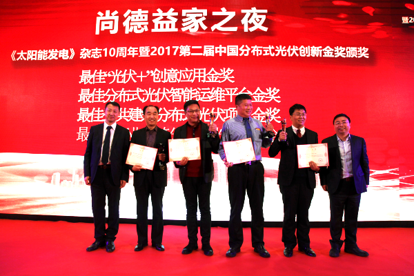 在“尚德益家之夜•《太陽能發(fā)電》雜志十周年暨2017第二屆全國分布式光伏創(chuàng)新金獎頒獎晚宴”上,合肥微納電工有限公司選送的“萬鵬機電分布式光伏電站”項目榮獲2017年度全國最佳工商業(yè)建筑分布式光伏金獎。