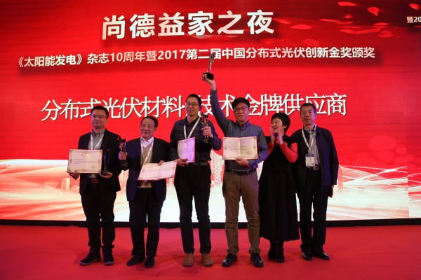 在“尚德益家之夜•《太陽(yáng)能發(fā)電》雜志十周年暨2017第二屆全國(guó)分布式光伏創(chuàng)新金獎(jiǎng)?lì)C獎(jiǎng)晚宴”上,煙臺(tái)鼎城新能源光伏有限公司選送的“高平整度一體化太陽(yáng)能發(fā)電整體屋頂”、杭州福膜新材料科技股份有限公司選送的“SOLVAN PV1010系列PVDF膜”、浙江凌志新材料有限公司選送的“有機(jī)硅在光伏領(lǐng)域的應(yīng)用”、史陶比爾(杭州)精密機(jī)械電子有限公司選送的“MC4光伏連接器”榮獲2017年度全國(guó)分布式光伏材料/技術(shù)金牌供應(yīng)商獎(jiǎng)。