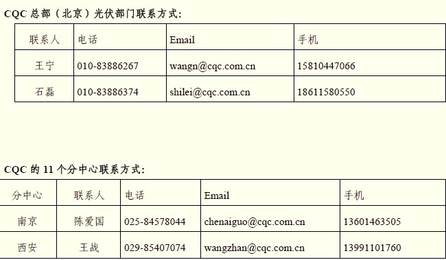 各相關(guān)單位: 國務(wù)院于2013年7月發(fā)布《國務(wù)院關(guān)于促進(jìn)光伏產(chǎn)業(yè)健康發(fā)展的若干意見》(國發(fā)〔2013〕24 號),支持開拓分布式光伏發(fā)電市場,有序推進(jìn)光伏電站建設(shè);同時(shí)要求加強(qiáng)硅材料及硅片、光伏電池及組件、逆變器及控制設(shè)備等產(chǎn)品的檢測和認(rèn)證平臺建設(shè),健全光伏產(chǎn)品檢測和認(rèn)證體系,及時(shí)發(fā)布符合標(biāo)準(zhǔn)的光伏產(chǎn)品目錄。實(shí)行光伏電池組件、逆變器、控制設(shè)備等關(guān)鍵產(chǎn)品檢測認(rèn)證制度,未通過檢測認(rèn)證的產(chǎn)品不準(zhǔn)進(jìn)入市場。 國家能源局于2013年8月發(fā)布《國家能源局關(guān)于印發(fā)光伏電站項(xiàng)目管理暫行辦法的通知》(國能新能〔2013〕329號),要求光伏電站項(xiàng)目應(yīng)符合國家有關(guān)光伏電站接入電網(wǎng)的技術(shù)標(biāo)準(zhǔn),涉網(wǎng)設(shè)備必須通過檢測認(rèn)證。 國家能源局于2013年11月發(fā)布《國家能源局關(guān)于印發(fā)分布式光伏發(fā)電項(xiàng)目管理暫行辦法的通知》(國能新能〔2013〕433號),要求分布式光伏發(fā)電項(xiàng)目所采用的光伏電池組件、逆變器等設(shè)備應(yīng)通過符合國家規(guī)定的認(rèn)證認(rèn)可機(jī)構(gòu)的檢測認(rèn)證,符合相關(guān)接入電網(wǎng)的技術(shù)要求。 國家認(rèn)監(jiān)委、國家能源局于2014年2月聯(lián)合發(fā)布《國家認(rèn)監(jiān)委 國家能源局關(guān)于加強(qiáng)光伏產(chǎn)品檢測認(rèn)證工作的實(shí)施意見》(國認(rèn)證聯(lián)〔2014〕10號),要求加強(qiáng)光伏產(chǎn)品檢測認(rèn)證工作,提高光伏產(chǎn)品質(zhì)量,嚴(yán)格執(zhí)行檢測認(rèn)證制度和市場準(zhǔn)入,現(xiàn)階段光伏產(chǎn)品檢測認(rèn)證的產(chǎn)品范圍,包括光伏電池組件、逆變器、控制設(shè)備、匯流設(shè)備、儲能設(shè)備以及獨(dú)立光伏系統(tǒng)等,根據(jù)市場需求和技術(shù)進(jìn)步情況將適時(shí)擴(kuò)大檢測認(rèn)證產(chǎn)品范圍。接入公共電網(wǎng)的光伏發(fā)電項(xiàng)目和享受各級政府補(bǔ)貼的非并網(wǎng)獨(dú)立光伏發(fā)電項(xiàng)目,須采用經(jīng)國家認(rèn)監(jiān)委批準(zhǔn)的認(rèn)證機(jī)構(gòu)認(rèn)證的光伏產(chǎn)品(簡稱為獲證產(chǎn)品)。建設(shè)單位進(jìn)行設(shè)備采購招標(biāo)時(shí),應(yīng)明確要求采用獲證產(chǎn)品。 為促進(jìn)我國光伏產(chǎn)品準(zhǔn)入制度的順利實(shí)施,中國質(zhì)量認(rèn)證中心(簡稱為CQC)將竭誠為太陽能光伏產(chǎn)品生產(chǎn)企業(yè)提供服務(wù)。CQC提供的太陽能光伏產(chǎn)品認(rèn)證服務(wù)已獲得中國認(rèn)證認(rèn)可監(jiān)督管理委員會(簡稱為CNCA)的正式批準(zhǔn),符合我國各級能源主管部門對認(rèn)證機(jī)構(gòu)的規(guī)定,具備對光伏組件、逆變器、控制設(shè)備、匯流設(shè)備、儲能設(shè)備獨(dú)立光伏系統(tǒng)、光伏接線盒、光伏連接器、太陽模擬器、光伏跟蹤系統(tǒng)、光伏組件封裝材料等主要太陽能光伏發(fā)電產(chǎn)品實(shí)施認(rèn)證的能力。 作為依法設(shè)立、社會各界認(rèn)可的國家級認(rèn)證機(jī)構(gòu),CQC愿與各界同仁一道努力,共同推動(dòng)我國光伏產(chǎn)業(yè)的健康發(fā)展,繼續(xù)為建設(shè)資源節(jié)約型和環(huán)境友好型的中國社會作出自己的貢獻(xiàn)。 CQC光伏業(yè)務(wù)部門的聯(lián)系方式請見下圖:
