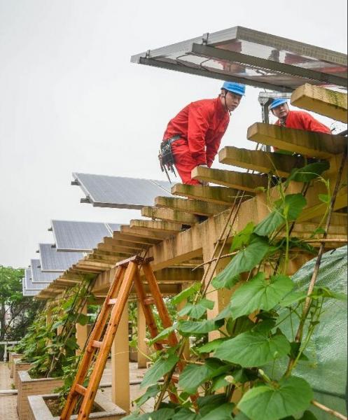 5月30日,長興縣供電公司黨員服務(wù)隊隊員查看農(nóng)戶徐民家葡萄架上的光伏設(shè)備并網(wǎng)運行情況。新華社記者 徐昱 攝 徐民的這套光伏發(fā)電設(shè)備共由32塊光伏組件構(gòu)成,輸出功率為8千瓦,年發(fā)電預(yù)計能達到9000-10000千瓦時,相當于減少8.1噸至9噸碳排放。近年來,浙江省長興縣