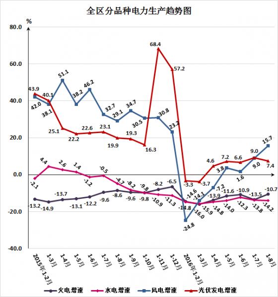 8月份,寧夏回族自治區(qū)工業(yè)發(fā)電量93.3億千瓦時(shí),同比下降1%,降幅環(huán)比收窄5.5個(gè)百分點(diǎn)。 1-8月,寧夏回族自治區(qū)工業(yè)發(fā)電量680.1億千瓦時(shí),同比下降8%,降幅環(huán)比收窄3個(gè)百分點(diǎn);其中,火力發(fā)電量577.3億千瓦時(shí),同比下降10.7%,降幅環(huán)比收窄2.8個(gè)百分點(diǎn)。 清潔能源生產(chǎn)增速加快。1-8月,寧夏回族自治區(qū)水電、風(fēng)電、太陽能等清潔電力發(fā)電量102.8億千瓦時(shí),同比增長10.3%,增速環(huán)比加快3.8個(gè)百分點(diǎn)。 三、其他能源產(chǎn)品平穩(wěn)較快增長 在統(tǒng)計(jì)的32種能源產(chǎn)品中,6成以上能源產(chǎn)品生產(chǎn)保持增長。1-8月,洗煤產(chǎn)量3910.5萬噸,同比增長1.5倍;原油加工量377.6萬噸,同比增長25.1%;汽油產(chǎn)量171萬噸,同比增長29.7%;柴油產(chǎn)量155.1萬噸,同比增長21.8%;焦炭產(chǎn)量504.7萬噸,同比下降0.4%。 |