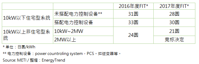 日本經(jīng)濟(jì)產(chǎn)業(yè)省(METI)在今年的第六次再生能源價格審議委員會上做出2017年度(平成29年)的太陽能固定價格買取(躉購,F(xiàn)IT)費用,將按計畫下調(diào)至每kWh最低21日元。此外,2MW以上的大型系統(tǒng)也將在明年正式采用競標(biāo)制。