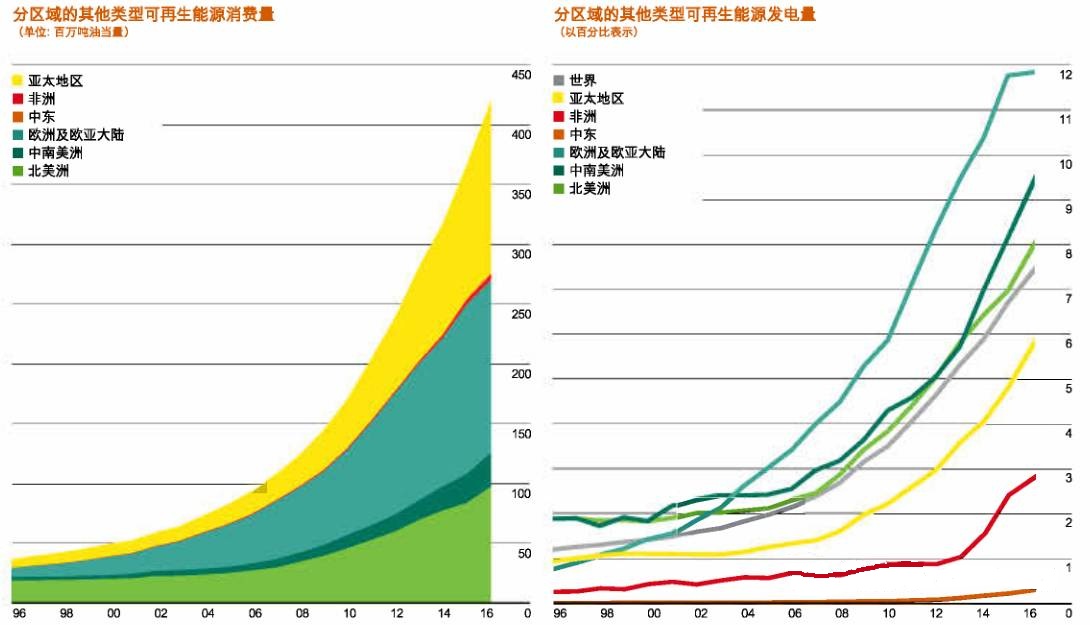 今天(7月5日),第66版《BP世界能源統(tǒng)計(jì)年鑒(2017年)》(中文版)(以下簡稱“《年鑒》”)在北京發(fā)布。 2017年版數(shù)據(jù)明確顯示市場正在經(jīng)歷長期轉(zhuǎn)變,包括全球能源需求增長放緩,需求大幅轉(zhuǎn)移到亞洲快速增長的發(fā)展經(jīng)濟(jì)體,以及隨著可再生能源繼續(xù)強(qiáng)勁增長和煤炭使用量下滑,能源結(jié)構(gòu)正在向更低碳的燃料轉(zhuǎn)型。 全球能源動態(tài) 6 大要點(diǎn)搶先看 、 全球能源需求情況: 2016年全球的能源需求連續(xù)第三年保持疲軟態(tài)勢,僅增長1%,約為過去十年平均增長率的一半。 2016年的增長仍基本來自于快速增長的發(fā)展中經(jīng)濟(jì)體,有一半的增長量來自中國和印度。 ![]() 2016年全球一次能源消費(fèi)量增長1.0%,遠(yuǎn)低于十年平均增速1.8%,且連續(xù)三年增速不高于1%。與2015年情況一致,除歐洲及歐亞大陸以外,其他所在地區(qū)的增速低于平均水平。除石油和核能外的所有燃料增速均低于平均水平。 、 石油: 2016年較低的石油價(jià)格使需求增長1.6%,而產(chǎn)量增長卻只有0.5%。因此,石油市場于年中大致回歸平衡,但油價(jià)仍受制于長期積累的龐大庫存。 、 天然氣: 天然氣產(chǎn)量也受到低價(jià)的不利影響,僅增長0.3%。 美國天然氣產(chǎn)量出現(xiàn)了自2005年頁巖氣革命以來的第一次下降(—170億立方米,—2.5%) 、 可再生能源: 可再生能源仍是所有能源中增長最快的部分,增幅達(dá)到12%。雖然可再生能源在一次能源總量中僅占4%的份額,但其增長在2016年占能源需求總增量的近三分之一。 、 煤炭: 煤炭使用量連續(xù)第二年出現(xiàn)急劇下滑,跌幅達(dá)1.7%,主要原因是中美兩國需求的減少。 、 碳排放情況: 能源需求增長緩慢加上燃料結(jié)構(gòu)的轉(zhuǎn)變,估計(jì)全球的碳排放增長只有0.1%,2016年因此成為碳排放保持穩(wěn)定甚至下滑趨勢的連續(xù)第三個(gè)年頭。這也是1981-1983年以來碳排放增長連續(xù)三年平均水平的最低值。 最值得關(guān)注的 3 大中國要點(diǎn) ① 中國仍然是世界上最大的能源消費(fèi)國: 中國占全球能源消費(fèi)量的23%,全球能源消費(fèi)增長的27%。 ② 中國的能源結(jié)構(gòu)持續(xù)改進(jìn): 盡管煤炭仍是中國能源消費(fèi)中的主要燃料(占比為62%),但是其產(chǎn)量下降7.9% ,創(chuàng)下自1981年開始追蹤該數(shù)據(jù)以來最大年度降幅。 ③ 二氧化碳排放量繼續(xù)下降: 中國的二氧化碳排放量連續(xù)第二年下降,降幅為0.7%。 可再生能源 ◆2016年可再生能源繼續(xù)保持最快的增長速度。不考慮水電,可再生能源增長了12%(包括風(fēng)電、地?zé)、太陽能、生物質(zhì)能、垃圾發(fā)電和生物燃料,不包括水電)。雖然低于15.7%的可再生能源十年平均增長水平,但這仍是有史以來最大的年增加量(增加5500萬噸油當(dāng)量,超出煤炭消耗量的減少量)。 ◆可再生能源目前僅占一次能源的4%。 ◆可再生能源增長一半以上來自風(fēng)電,風(fēng)電在2016年的增長為16%。太陽能增長30%。雖然太陽能僅占可再生能源產(chǎn)出的18%,但太陽能的增長量占可再生能源全部增長量的約三分之一。 ◆2016年,中國超越美國成為世界最大的可再生能源生產(chǎn)國,而亞太地區(qū)則超越歐洲和歐亞大陸成為可再生電力最大的生產(chǎn)地區(qū)。 ![]() 2016年可再生能源發(fā)電量(不包含水電)增長了14.1%,略低于十年平均增速,但是,這是有記錄以來最大增量(5290萬噸油當(dāng)量)。風(fēng)能提供了一半以上的增量,而太陽能則貢獻(xiàn)了幾乎三分之一的增量。盡管它僅占總量的18%。亞太地區(qū)貢獻(xiàn)了60%的增量,中國取代美國成為世界上最大可再生能源生產(chǎn)國。