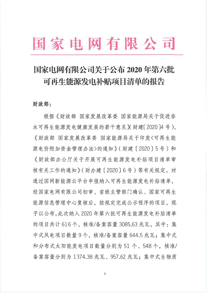 國家電網(wǎng)有限公司今日發(fā)布關(guān)于公布2020年第六批可再生能源發(fā)電補(bǔ)貼項目清單的公告。此次納入2020年第六批可再生能源發(fā)電補(bǔ)貼項目清單的項目共計616個,核準(zhǔn)\備案容量3085.63兆瓦。其中,集中式和分布式太陽能放到項目數(shù)量分別為51個.548個,核準(zhǔn)\備案容量分別為1347.38兆瓦、957.62兆瓦。公告稱, 2020年10