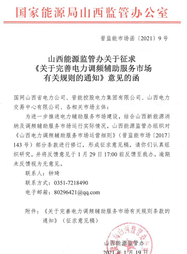 關(guān)于完善山西電力調(diào)頻輔助服務(wù)市場等有關(guān)事項(xiàng)征求意見