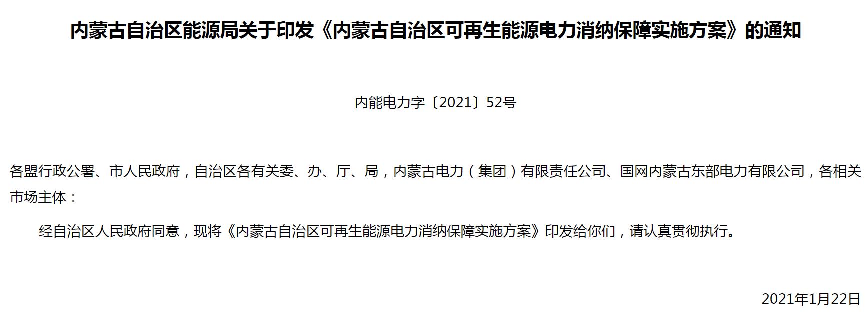 1月25日,內(nèi)蒙古自治區(qū)能源局印發(fā)《內(nèi)蒙古自治區(qū)可再生能源電力消納保障實(shí)施方案》,明確表示,大力發(fā)展新能源,進(jìn)一步增加可再生能源電力消納能力,到2025年,全區(qū)可再生能源電力總量消納責(zé)任權(quán)重力爭達(dá)到25%以上,推動自治區(qū)可再生能源高質(zhì)量發(fā)展!秾(shí)施方案》如下:內(nèi)蒙古自治區(qū)可再生能源電力消納保障實(shí)施方案為加快構(gòu)建清潔低