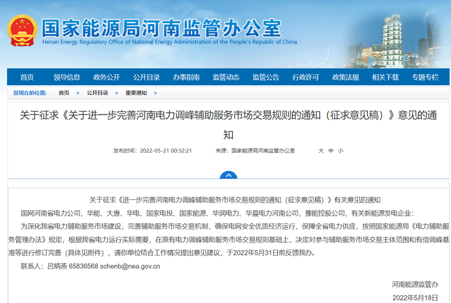 5月21日,國家能源局河南監(jiān)管辦印發(fā)《關(guān)于進一步完善河南電力調(diào)峰輔助服務(wù)市場交易規(guī)則的通知(征求意見稿)》意見的通知,根據(jù)電力運行實際需要,在原有電力調(diào)峰輔助服務(wù)市場交易規(guī)則基礎(chǔ)上,決定對參與輔助服務(wù)市場交易主體范圍和有償調(diào)峰基準等進行修訂完善,并征求意見和建議。關(guān)于進一步完善河南電力調(diào)峰輔助服務(wù)市場交