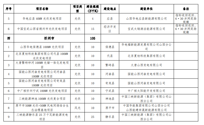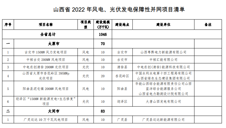 根據(jù)《2022年風電、光伏發(fā)電開發(fā)建設競爭性配置工作方案》,經各市初選上報,山西省能源局組織了2022年競爭性配置風電、光伏發(fā)電項目評審,優(yōu)選出“年度基本規(guī)!北U闲圆⒕W項目83個、規(guī)模922萬千瓦,現(xiàn)將結果予以公示。各市確定的“指標收回返回規(guī)!薄ⅰ6*30并網獎勵規(guī)!表椖15個、規(guī)模124萬千瓦