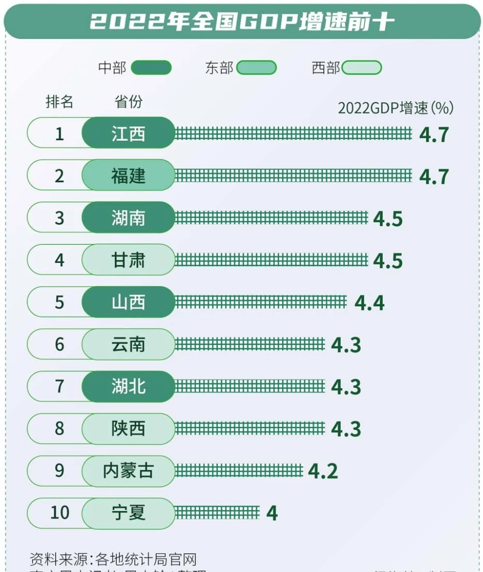 癸卯兔年鐘聲響起,中國31省直轄市自治區(qū)陸續(xù)公布2022年全年的經(jīng)濟運行成績單。 2022年,中國經(jīng)濟總量突破120萬億,達到121萬億元,GDP增速為3%。國家統(tǒng)計局局長康義接受媒體采訪時表示,按年均匯率計算,120萬億元折合美元約18萬億美元,穩(wěn)居世界第二位。 31省份中,廣東以129118.58億元居GDP總量榜首,安徽超越上海首次躋身全國經(jīng)濟十強,這意味著中部省份又添一席,幾乎與東部平分秋色。 其中,16省份的GDP增速跑贏全國,江西與福建并列第一,GDP增速同為4.7%,高出全國1.7個百分點。增速前十的省份中,中部省份占四席,西部省份占五席。 制造業(yè)壓艙 中部六省中,河南、湖北和湖南長期穩(wěn)居GDP前十。2022年,安徽以392.2億元的微弱優(yōu)勢超越上海,成為全國GDP前十名中的第四個中部省份,經(jīng)濟增速高出全國增速0.5個百分點。 中國按照經(jīng)濟分區(qū)分為東部、中部、西部和東北四個區(qū)域。中部指的是山西、河南、安徽、湖北、江西、湖南6省;東部包括北京、天津、河北、上海、江蘇、浙江、福建、山東、廣東、海南10省份;西部包括重慶、四川、云南、貴州、西藏、陜西、甘肅、青海、新疆、寧夏、內(nèi)蒙古和廣西12省份;東北則是遼寧、吉林、黑龍江3省。 安徽位于長江、淮河中下游,素有“江南糧倉”之稱。2022年,安徽糧食產(chǎn)量居全國第四。 2018年,安徽GDP排名位于全國第13名,同年11月,安徽全省劃入經(jīng)濟發(fā)展最活躍的“長江三角洲”地區(qū)。2019年,安徽GDP已逼近上海,距離全國十強僅一步之遙。 從地市數(shù)據(jù)來看,對安徽GDP總量貢獻最大的是省會合肥。 頭頂“風投之城”光環(huán)的合肥多次踩中時代風口,不僅投資了京東方、長鑫、蔚來汽車,還培育了科大訊飛等人工智能領域龍頭企業(yè)。加上越來越多“國字號”科創(chuàng)中心落戶合肥,合肥已形成從家電、面板到芯片、人工智能和新能源產(chǎn)業(yè)等工業(yè)產(chǎn)業(yè)集群。 中國社會科學院西部發(fā)展研究中心副主任、區(qū)域經(jīng)濟研究室主任陳耀告訴南方周末記者,安徽通過創(chuàng)新驅(qū)動經(jīng)濟發(fā)展,此次邁入全國經(jīng)濟十強有跡可循。一方面是安徽積極布局科技前沿領域,如智能語音、人工智能、量子科技產(chǎn)業(yè),通過產(chǎn)學研一體化合作實現(xiàn)落地轉(zhuǎn)化。 同時,安徽也善于抓住發(fā)展機遇,承接了長三角的產(chǎn)業(yè)轉(zhuǎn)移。陳耀表示,對于經(jīng)濟發(fā)展程度較高的長三角城市而言,安徽的相對優(yōu)勢體現(xiàn)在交通方便、有較多的土地指標、能耗指標充足、用工成本較低等。 2022年,安徽規(guī)模以上工業(yè)增加值比2021年增長6.1%,比全國高2.5個百分點,增速居長三角第一。尤其是高技術制造業(yè)和裝備制造業(yè),分別占規(guī)上工業(yè)增加值比重的14.2%和35.2%。 在工業(yè)培育上,安徽的高技術產(chǎn)業(yè)投資增長37.6%,其中高技術制造業(yè)投資增長44.8%。工業(yè)新產(chǎn)品,光纖產(chǎn)量增長23.6倍,新能源汽車和太陽能電池分別增長67.5%和33.6%。 “全球10%的筆記本電腦、20%的液晶顯示屏在安徽制造!2023年1月13日,安徽省省長王清憲在作政府工作報告時說,由此可以說明安徽已從“農(nóng)業(yè)大省”轉(zhuǎn)變?yōu)椤肮I(yè)強省”。 搭上新能源快車 江西在中部六省中的GDP總量排在第五,卻以4.7%的GDP增速躍升至全國第一。值得注意的是,江西近五年來維持GDP增速前十,除了2020年和2021年外,其GDP增速均居中部省份第一。 江西省統(tǒng)計局國民經(jīng)濟核算處處長周紅接受媒體采訪時表示,江西GDP增長背后,第二產(chǎn)業(yè)貢獻突出。全省第二產(chǎn)業(yè)實現(xiàn)增加值14359.6億元,同比增長5.4%,對經(jīng)濟增長的貢獻率為49.9%,較2021年同期提高2.5個百分點,拉動GDP增長2.4個百分點。 陳耀介紹,與安徽類似,江西主要承接長珠閩等東部沿海省份的產(chǎn)業(yè)外溢。加上江西擁有豐富的金屬礦產(chǎn),新能源、新材料相關產(chǎn)業(yè)順理成章地在江西生根發(fā)芽,成為江西工業(yè)增長的支撐力量。 以鋰資源為例,2021年以來,江西先后吸引大量鋰電行業(yè)頭部企業(yè)落戶江西。國軒高科、贛鋒鋰業(yè)、大唐發(fā)電等一批新能源上市公司奔赴有著“亞洲鋰都”之稱的江西宜春,爭相“搶鋰”。 2022年,宜春GDP總量在江西11個地市中排在全省第四。固定資產(chǎn)投資增速9.8%,排在全省首位,規(guī)上工業(yè)增加值增長9%,排在全省第二。除了宜春,上饒、贛州也吸引到不少新能源整車企業(yè)和汽車零部件企業(yè)落戶。 整體來看,江西的投資、消費和出口“三駕馬車”增長可觀。2022年,固定資產(chǎn)投資增長8.6%,排在全國第七;社會消費品零售總額增長5.3%,排全國第二;進出口總值增長34.9%,排全國第三。 數(shù)據(jù)顯示,江西省重點監(jiān)測的440種主要工業(yè)產(chǎn)品中有176種實現(xiàn)增長,其中,新能源汽車、太陽能電池、集成電路產(chǎn)量分別增長122.8%、285.8%、68.4%。 新能源相關產(chǎn)品在消費和進出口上都有不俗的表現(xiàn)。比如,限額以上單位新能源汽車商品零售額增長125.1%;從產(chǎn)業(yè)看,電子信息產(chǎn)業(yè)進出口1746.6億元,增長28.8%;鋰電產(chǎn)業(yè)進出口396.8億元,增長2.5倍;光伏產(chǎn)業(yè)進出口263.3