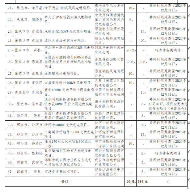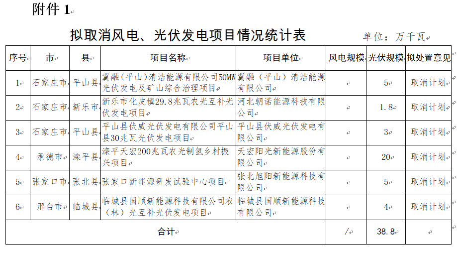 4月18日,河北省發(fā)改委對(duì)2022年到期風(fēng)電、光伏發(fā)電項(xiàng)目擬調(diào)整情況進(jìn)行公示。公示表示,為進(jìn)一步加強(qiáng)風(fēng)電、光伏發(fā)電項(xiàng)目管理,對(duì)2022年底已到期風(fēng)電、光伏發(fā)電項(xiàng)目建設(shè)進(jìn)度進(jìn)行了摸底統(tǒng)計(jì),并對(duì)逾期未建成項(xiàng)目提出了處置意見。其中,擬取消8個(gè)風(fēng)電、光伏發(fā)電項(xiàng)目,規(guī)模合計(jì)388MW;風(fēng)電、光伏發(fā)電項(xiàng)目擬調(diào)整37個(gè),
