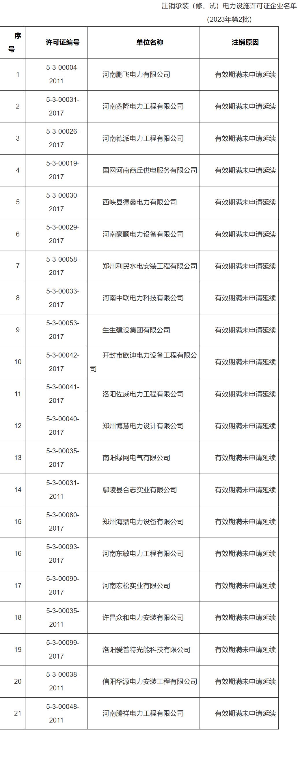 日前,河南能源監(jiān)管辦發(fā)布關(guān)于注銷未完成續(xù)期企業(yè)承裝(修、試)電力設(shè)施許可證的公告,河南鵬飛電力有限公司等21家承裝(修、試)電力設(shè)施企業(yè)未在規(guī)定期限內(nèi)提交許可延續(xù)申請(qǐng),按規(guī)定應(yīng)予注銷。
