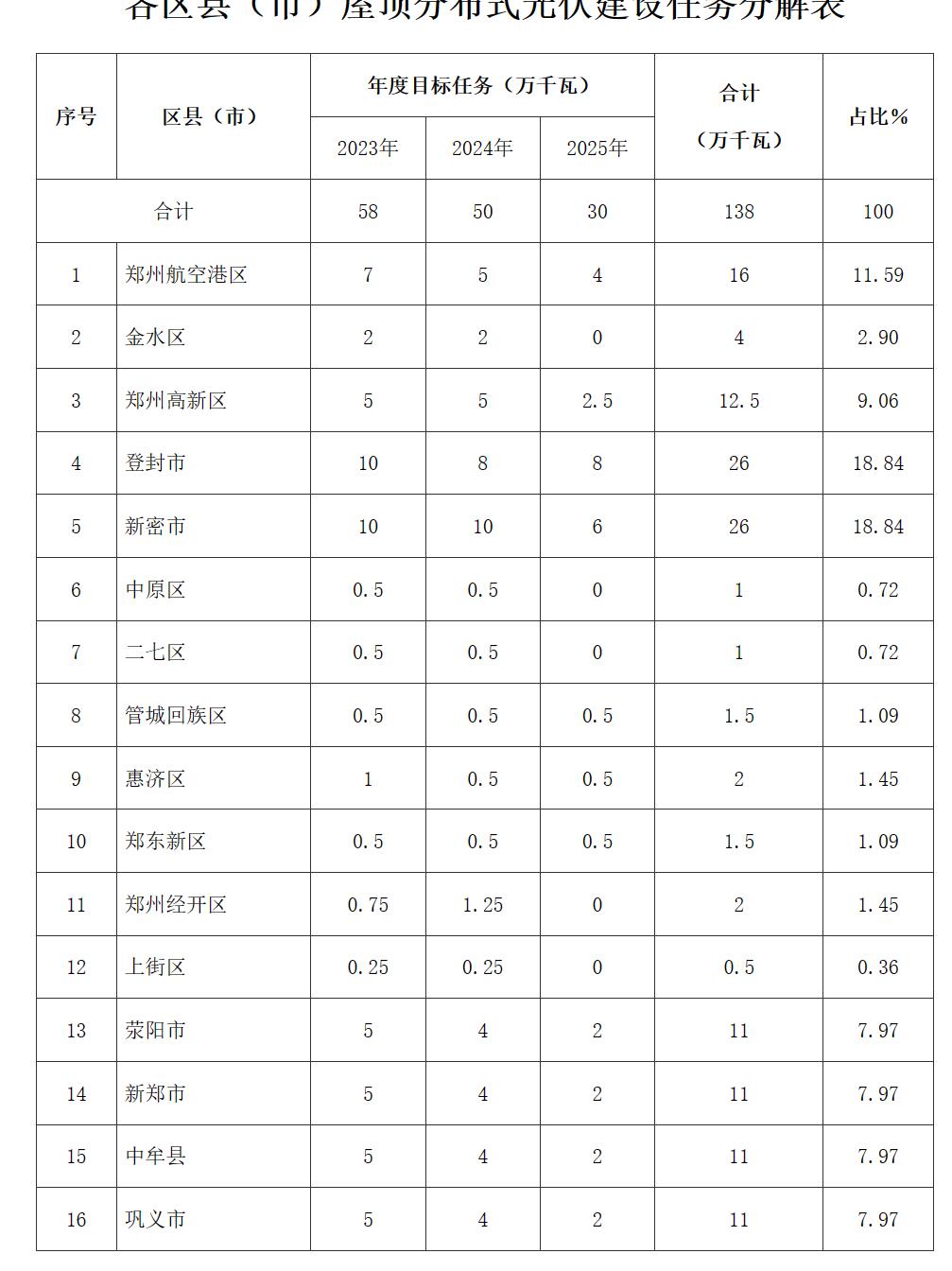 據(jù)鄭州市人民政府官網(wǎng):7月20日 ,鄭州市人民政府發(fā)布《關(guān)于加快推進全市屋頂分布式光伏發(fā)電開發(fā)利用的實施意見(試行)》明確:以整區(qū)縣(市)屋頂分布式光伏開發(fā)試點為抓手,重點圍繞工業(yè)建筑光伏開發(fā)利用、公共建筑光伏開發(fā)利用、綠色建筑領(lǐng)域的光伏開發(fā)利用、開發(fā)和創(chuàng)新光伏發(fā)電利用場景、推動光伏發(fā)電項目配建儲能設(shè)施等五個方面,加快推進光伏項目建設(shè)。利用三年時間,到2025年末,全市新增屋頂分布式光伏裝機并網(wǎng)容量138萬千瓦,累計并網(wǎng)容量達到200萬千瓦以上。《實施意見》提出:屋頂分布式光伏投資企業(yè)依法建設(shè)、經(jīng)營和管理,各項法定手續(xù)完善,符合國家、省、市信用管理規(guī)定,履行合同較好的給予政策支持。補貼標準以供電公司實際上網(wǎng)電量為準,2023年1月1日-2024年12月31日建成并網(wǎng),按0.1元/千瓦時補助;2025年1月1日-2025年12月31日建成并網(wǎng),按0.05元/千瓦時補助,每個項目享受補貼年限3年。同時,根據(jù)區(qū)縣(市)財政事權(quán)與支出責任劃分市內(nèi)五區(qū)、三個開發(fā)區(qū)及上街區(qū)獎補資金,由市與區(qū)按照1:1承擔。航空港區(qū)及六縣(市)獎補資金可參照鄭州市標準執(zhí)行,費用由各區(qū)縣(市)承擔。 全文如下: 鄭州市人民政府 關(guān)于加快推進全市屋頂分布式光伏發(fā)電開發(fā)利用的實施意見(試行) 鄭政〔2023〕15號 各開發(fā)區(qū)管委會,各區(qū)縣(市)人民政府,市人民政府各部門,各有關(guān)單位: 為全面貫徹落實黨中央、國務(wù)院和省、市關(guān)于“碳達峰碳中和”工作決策部署,進一步加強清潔能源開發(fā)利用,促進全市能源結(jié)構(gòu)調(diào)整優(yōu)化,結(jié)合我市實際,現(xiàn)就加快推進全市屋頂分布式光伏發(fā)電開發(fā)利用提出以下實施意見。 一、總體要求 (一)指導(dǎo)思想 以習(xí)近平新時代中國特色社會主義思想為指導(dǎo),聚焦“碳達峰碳中和”目標任務(wù),建立。ㄊ校⿲偻度谫Y平臺或具備實力的大型能源企業(yè)+政策性銀行+供應(yīng)鏈企業(yè)+區(qū)縣(市)投融資平臺或戰(zhàn)略合作企業(yè)的“1+1+1+X”推進服務(wù)機制,為屋頂分布式光伏開發(fā)提供投資、融資、建設(shè)、運營、維護等綜合托底服務(wù),加快推進屋頂分布式光伏發(fā)電項目建設(shè),為構(gòu)建清潔低碳的能源消費體系提供有力支撐。 (二)基本原則 因地制宜,有序推進。充分評估當?shù)匚蓓敼庹召Y源和電力消納能力,秉持科學(xué)有序原則,客觀評估項目可行性,鼓勵具備條件的地方率先示范。 政府引導(dǎo),市場主導(dǎo)。發(fā)揮政府統(tǒng)籌引導(dǎo)作用,落實市場化運作模式,鼓勵和支持符合條件的市場主體參與屋頂分布式光伏資源開發(fā)建設(shè)。 優(yōu)化服務(wù),保障安全。簡化優(yōu)化備案和并網(wǎng)流程,完善全流程工程質(zhì)量規(guī)范和安全規(guī)章制度,壓實企業(yè)安全生產(chǎn)主體責任。 (三)工作目標 到2025年底,全市新增屋頂分布式光伏裝機并網(wǎng)容量138萬千瓦(見附件1),累計并網(wǎng)容量達到200萬千瓦,光伏發(fā)電裝機規(guī)模占全市電力裝機比重14%左右。 二、重點任務(wù) (一)加大工業(yè)建筑屋頂光伏開發(fā)利用力度 加快既有工業(yè)建筑屋頂資源開發(fā)利用,工業(yè)企業(yè)在符合安全條件前提下按照“宜建盡建”原則安裝屋頂光伏發(fā)電設(shè)施。國資為主投資建設(shè)的既有標準廠房及配套用房,具備安裝條件的應(yīng)安裝屋頂光伏發(fā)電設(shè)施。新建工業(yè)建筑,鼓勵同步設(shè)計和建設(shè)光伏發(fā)電設(shè)施。各區(qū)縣(市)要以開發(fā)區(qū)、產(chǎn)業(yè)園區(qū)、高耗能行業(yè)為重點,結(jié)合光伏開發(fā)方案,持續(xù)開展既有工業(yè)建筑屋頂資源梳理排查,建立符合安全條件的屋頂資源項目清單,實行動態(tài)管理,有序推進開發(fā)。 牽頭單位:市工信局 責任單位:市發(fā)展改革委、市資源規(guī)劃局、市城建局、市國資委,鄭州供電公司,各開發(fā)區(qū)管委會,區(qū)縣(市)人民政府 (二)積極推進公共建筑屋頂光伏開發(fā)利用 按照高水平設(shè)計、高標準建設(shè)、高質(zhì)量應(yīng)用的原則,充分發(fā)揮黨政機關(guān)、國有企業(yè)和事業(yè)單位示范帶動作用,推動機關(guān)辦公樓宇、學(xué)校、醫(yī)院、文體設(shè)施、城市展覽館、泵站水閘、自來水廠、污水處理廠、公交場站、候車室、國省干道休息區(qū)、道班等公共機構(gòu)建筑、公共基礎(chǔ)設(shè)施開發(fā)建設(shè)屋頂分布式光伏項目。支持光伏開發(fā)主體通過合同能源管理等形式參與黨政機關(guān)、學(xué)校醫(yī)院等事業(yè)單位電費支付結(jié)算。鼓勵在大型商超、倉儲物流、商務(wù)樓宇、賓館酒店等建筑屋頂開發(fā)建設(shè)光伏發(fā)電設(shè)施,大型商業(yè)企業(yè)在符合安全條件前提下,按照“宜建盡建”原則,安裝屋頂光伏發(fā)電設(shè)施。 牽頭單位:市發(fā)展改革委、市事管局 責任單位:市教育局、市住房保障局、市商務(wù)局、市衛(wèi)健委、市城建局、市交通局、市城管局、市國資委,鄭州供電公司,各開發(fā)區(qū)管委會,區(qū)縣(市)人民政府 (三)加強綠