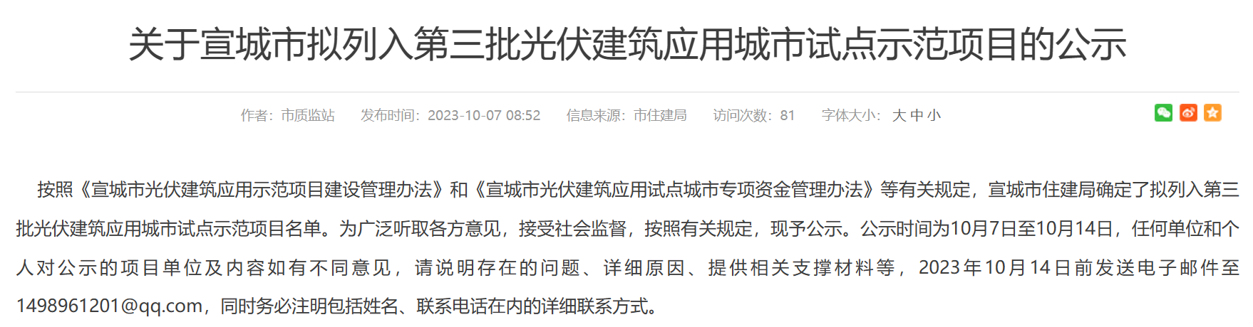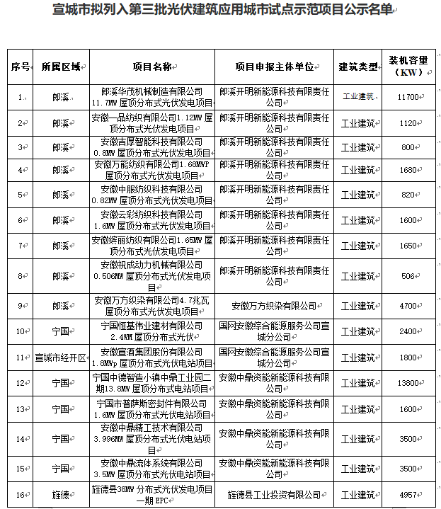 安徽宣城公示擬列入第三批光伏建筑應(yīng)用城市試點(diǎn)示范項(xiàng)目