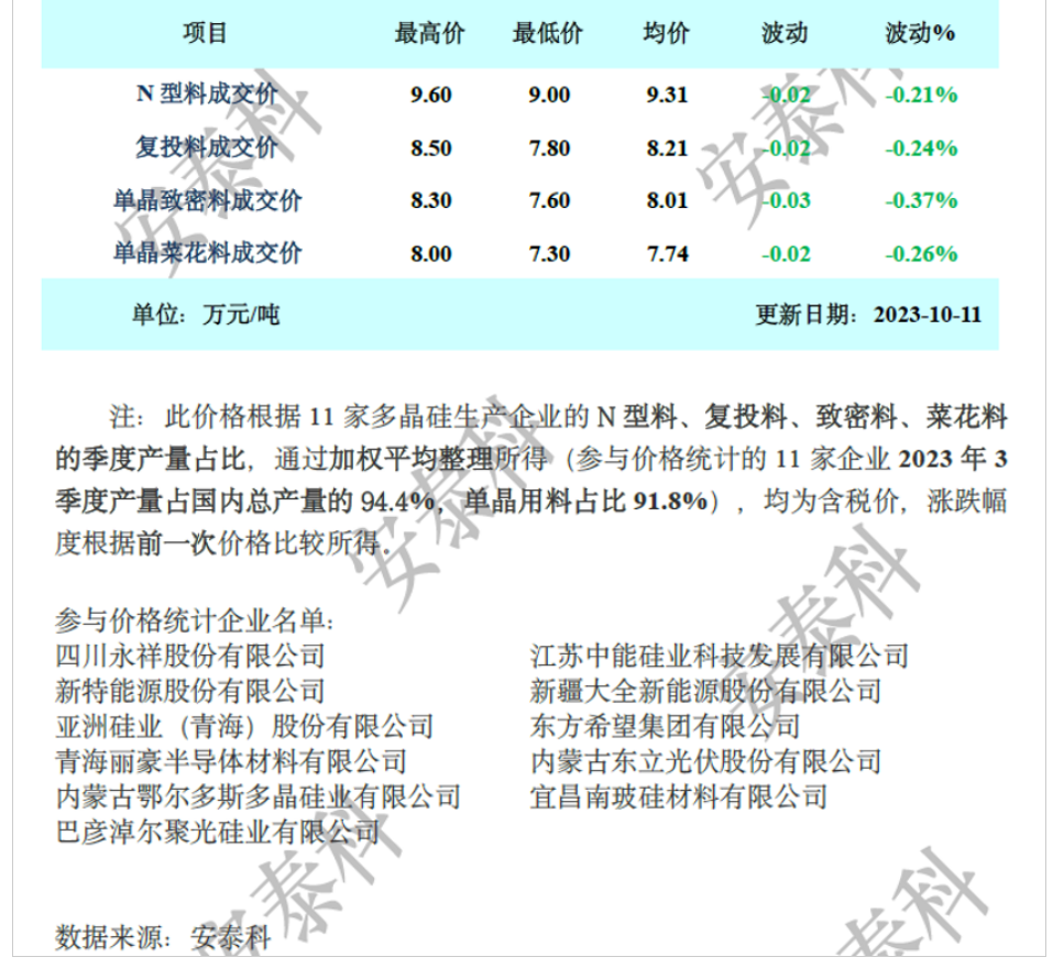 本周國內(nèi)N型硅料價格區(qū)間在9.0-9.6萬元/噸,環(huán)比跌幅為0.21%,單晶致密料價格區(qū)間在7.6-8.3萬元/噸,環(huán)比跌幅為0.37%。 本周為雙節(jié)過后第一次詢價,并未出現(xiàn)預(yù)期的集中簽單,仍以執(zhí)行前期訂單為主。目前企業(yè)前期訂單基本在本月月中能夠執(zhí)行完畢,但上下游議價困難加大,下游企業(yè)觀望態(tài)度明顯,新單磋商難度有所增加。本周N型、P型硅料各有3家企業(yè)成交,成交數(shù)量普遍較小,成交價格均有不同幅度的下調(diào),高價訂單基本已經(jīng)消失,幾家龍頭企業(yè)成交價格持穩(wěn),其余廠家成交價輕微松動。 本周硅料各品種的成交價格都有輕微下降,原因如下。第一,下游硅片企業(yè)持續(xù)降價,接受硅料價格能力有所減弱,且硅片環(huán)節(jié)出現(xiàn)出現(xiàn)幅度較高的減產(chǎn)傾向,對多晶硅料的采購開始放緩。第二,硅料產(chǎn)能持續(xù)擴張,上月檢修企業(yè)陸續(xù)恢復(fù)出量,外加合盛、弘元等企業(yè)新增產(chǎn)能釋放,硅料供應(yīng)逐步增加。第三,雖然硅料企業(yè)庫存處于低位,但下游硅片企業(yè)開工率降低和采購減弱,讓庫存再次從下游硅片企業(yè)逐步轉(zhuǎn)移到上游硅料,硅料將再次承受庫存壓力。綜上,全產(chǎn)業(yè)鏈各環(huán)節(jié)供需、庫存以及價格壓力逐步從下游向上游轉(zhuǎn)移。 截止本周,國內(nèi)硅料生產(chǎn)企業(yè)合計16家(包含新建投產(chǎn)企業(yè)2家),1家企業(yè)停產(chǎn)技改,2家企業(yè)檢修,其中1家檢修企業(yè)預(yù)計本月中旬陸續(xù)恢復(fù)。據(jù)硅業(yè)分會統(tǒng)計,9月份多晶硅產(chǎn)量12.62萬噸,環(huán)比上升8.48%,同比上升64.97%。1-9月份多晶硅產(chǎn)量為100.99萬噸,同比上漲87.95%。當(dāng)前多晶硅領(lǐng)域仍有新產(chǎn)能逐步釋放,外加部分企業(yè)檢修結(jié)束開始生產(chǎn),預(yù)計10月份產(chǎn)量可達(dá)13.5萬噸,環(huán)比漲幅7%左右。 ![]() |
