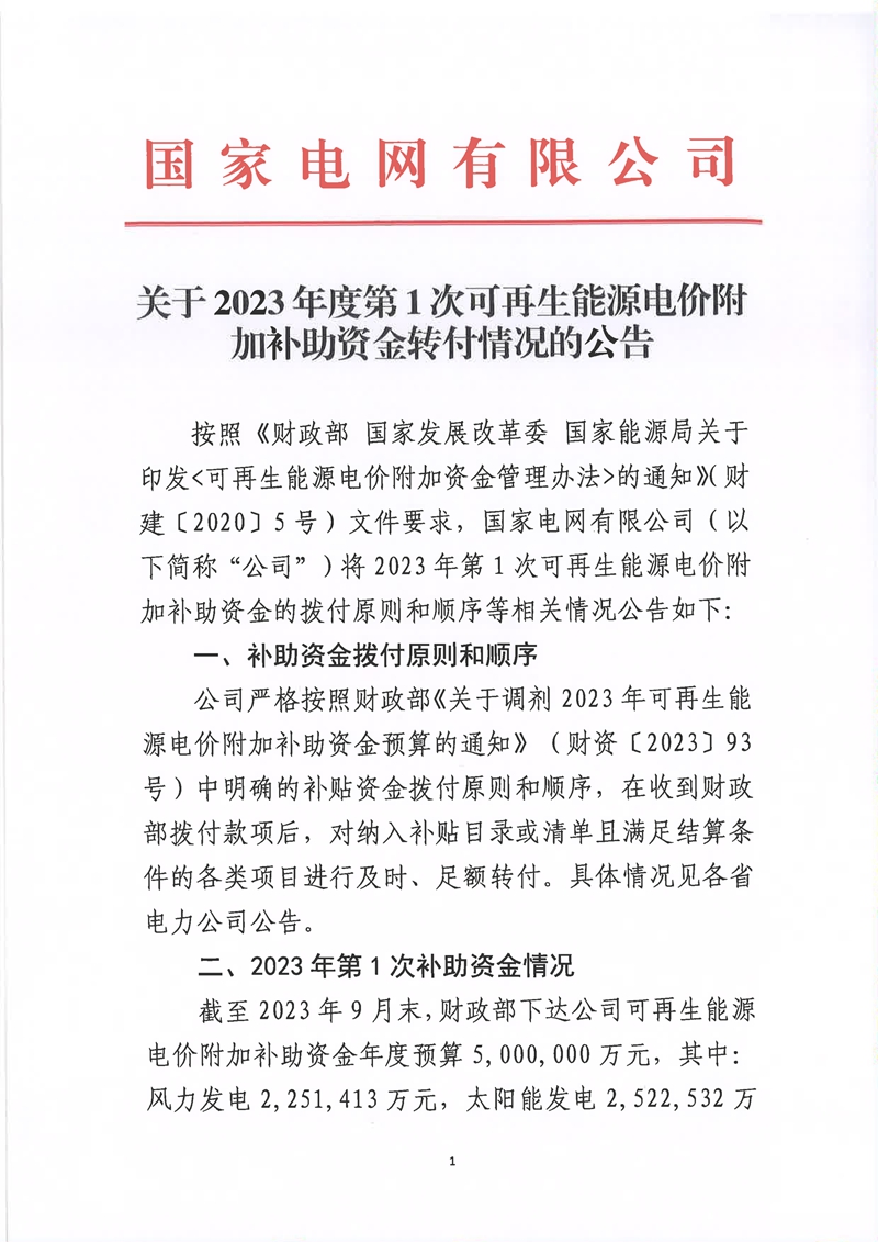 10月19日,國(guó)家電網(wǎng)發(fā)布關(guān)于2023年度第1次可再生能源電價(jià)附加補(bǔ)助資金轉(zhuǎn)付情況的公告,公告顯示,截至2023年9月末,財(cái)政部下達(dá)公司可再生能源電價(jià)附加補(bǔ)助資金年度預(yù)算5000000萬(wàn)元,其中風(fēng)力發(fā)電2251413萬(wàn)元,太陽(yáng)能發(fā)電2522532萬(wàn)元,生物質(zhì)能發(fā)電226055萬(wàn)元。 公告稱,公司嚴(yán)格按照財(cái)政部《關(guān)于調(diào)劑2023年可再生能源電價(jià)附加補(bǔ)助資金預(yù)算的通知》(財(cái)資〔2023〕93號(hào))中明確的補(bǔ)貼資金撥付原則和順序,在收到財(cái)政部撥付款項(xiàng)后,對(duì)納入補(bǔ)貼目錄或清單且滿足結(jié)算條件的各類項(xiàng)目進(jìn)行及時(shí)、足額轉(zhuǎn)付。具體情況見(jiàn)各省電力公司公告。 ![]() ![]() |