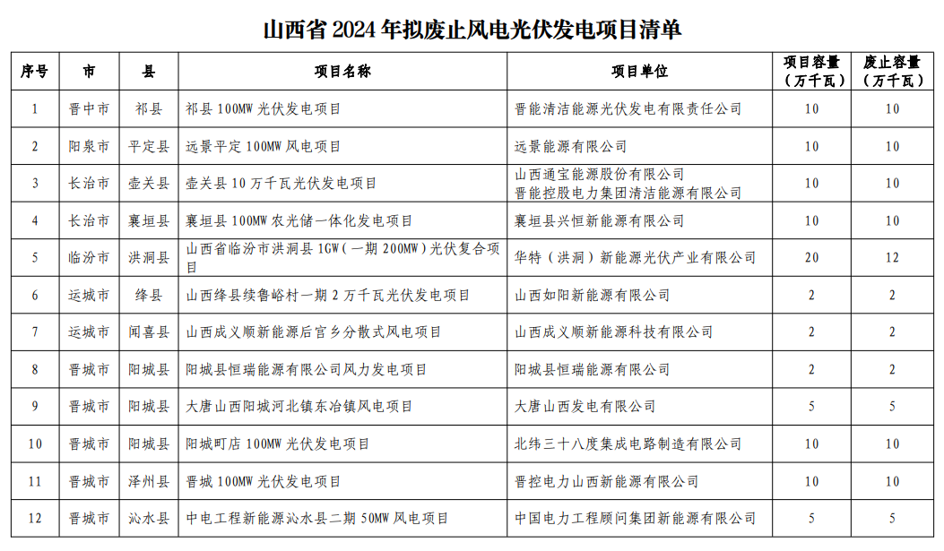 4月18日,山西省能源局發(fā)布關(guān)于對祁縣100MW光伏發(fā)電項(xiàng)目等風(fēng)電光伏發(fā)電項(xiàng)目擬廢止公示。 公示稱,為加快推進(jìn)新能源“十四五”規(guī)劃建設(shè)進(jìn)度,實(shí)現(xiàn)我省新能源產(chǎn)業(yè)高質(zhì)量發(fā)展,我局組織各市能源局對已列入年度建設(shè)規(guī)模項(xiàng)目單位投資不積極、確定無法建設(shè)的風(fēng)電光伏發(fā)電項(xiàng)目進(jìn)行了梳理。相關(guān)地市上報(bào)擬調(diào)整項(xiàng)目清單,經(jīng)我局匯總,擬將祁縣100MW光伏發(fā)電項(xiàng)目等12個(gè)項(xiàng)目,廢止規(guī)模88萬千瓦。 山西省2024年擬廢止風(fēng)電光伏發(fā)電項(xiàng)目清單如下: ![]() |