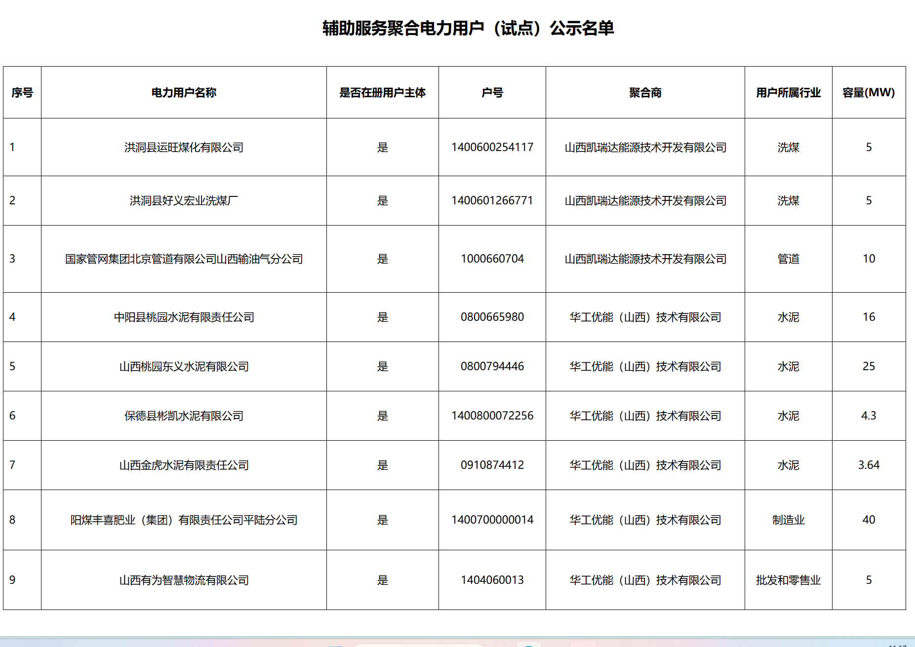 輔助服務(wù)聚合電力用戶(試點)公示名單如下: