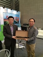 展位前絡(luò)繹不絕的觀眾 第一位大獎(jiǎng)獲得者(右一)與昱能科技童總(左一)合影 |